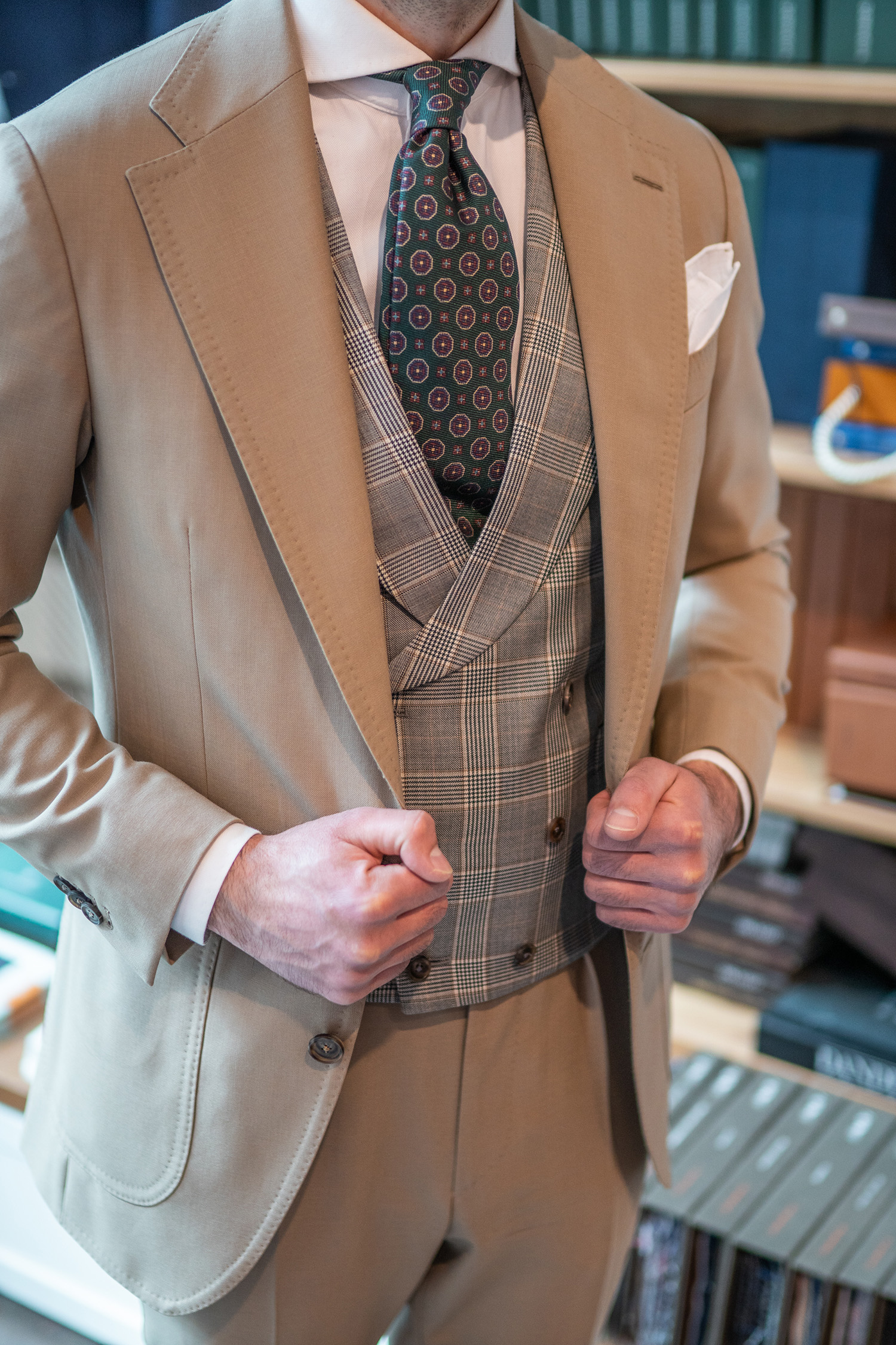 Garnitur ze zdjęcia tytułowego został uszyty w naszej pracowni Buczyński Szycie na Miarę - zobacz nasze realizacje. Beżowy garnitur ślubny możesz zobaczyć w pierwszej części naszego kompleksowego poradnika ślubnego.