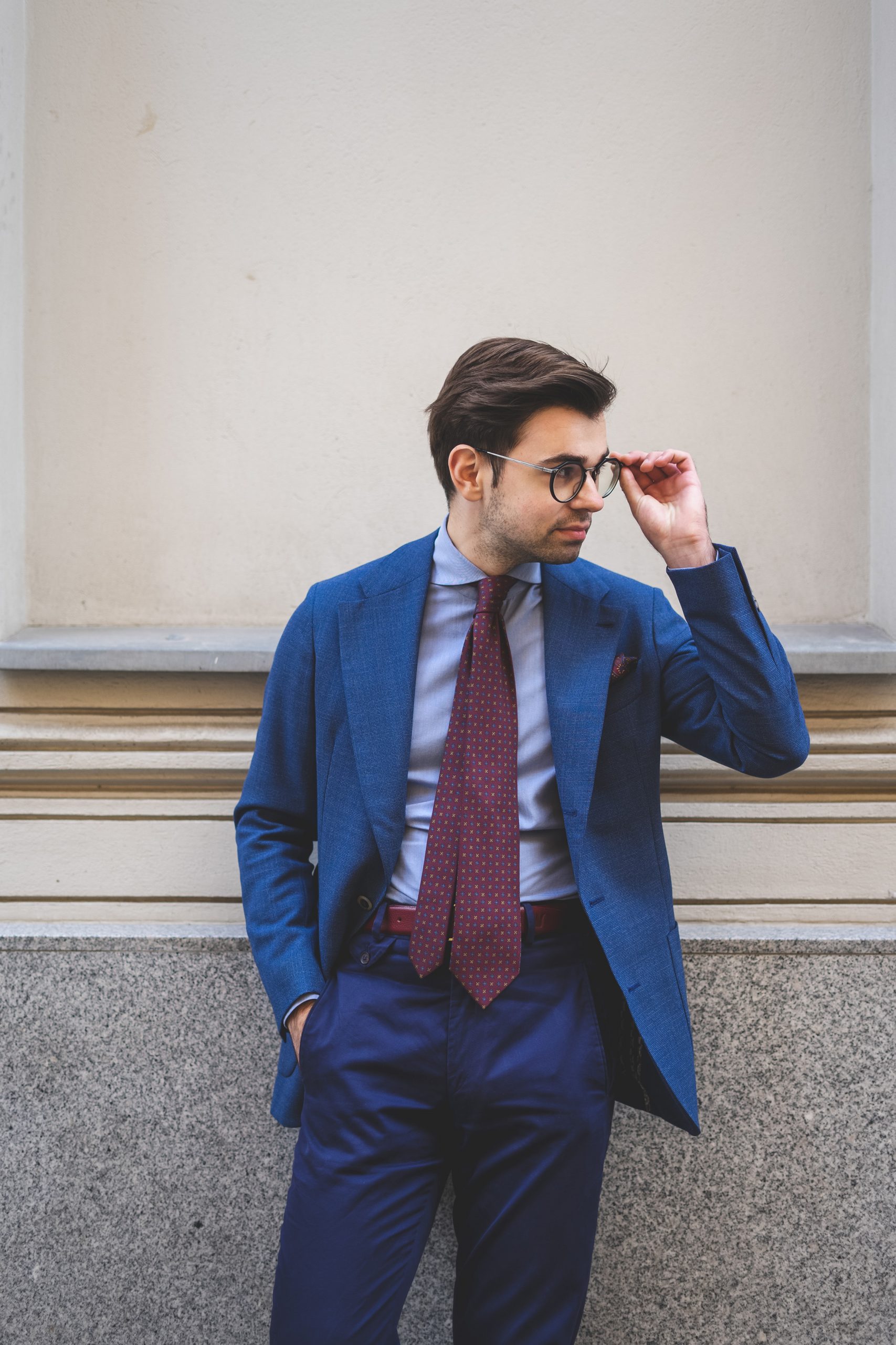 Dobierając granatowy jedwabny krawat do garnituru musimy pamiętać, że sam w sobie ten kolor może wydawać się nudny. My proponujemy urozmaicenie tego akcesorium poprzez wybranie wariantu ze złotymi ornamentami, które rozświetlą garnitur ślubny, jednocześnie pięknie współgrając z resztą zestawu. Taki krawat bezproblemowo można później wykorzystać w stylizacjach biznesowych, ponieważ sam w sobie nie będzie to krawat formalny - dużą rolę odgrywają dodatki.