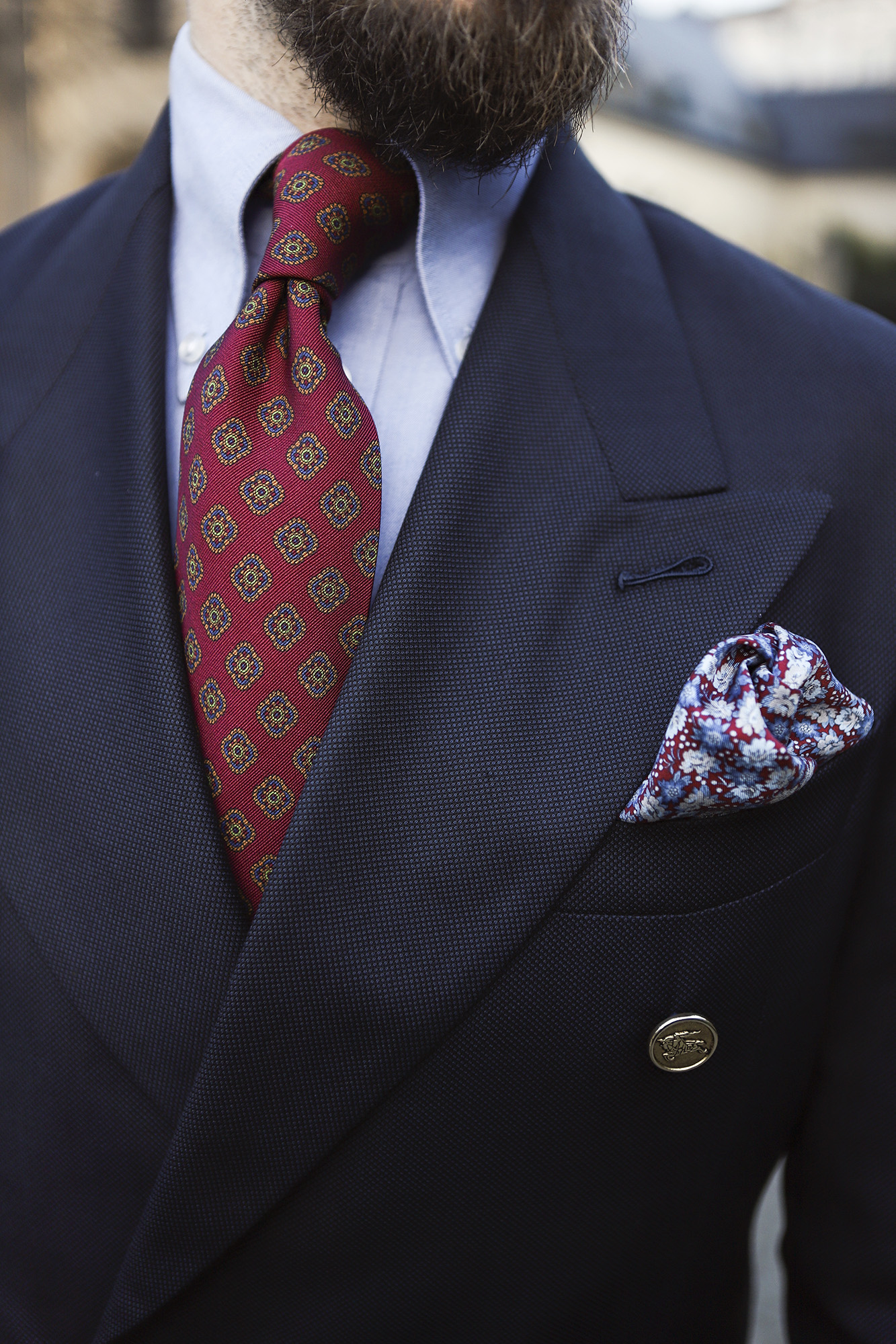 Prawdopodobnie nasz faworyt w całej kolekcji - najczęściej dopasowujemy go do granatowego, klasycznego garnituru i białej koszuli, więc stanowi on główny akcent kolorystyczny całej stylizacji. Jego kolor zwraca uwagę, ale nie można powiedzieć o nim, że jest neonowy, dzięki czemu pasuje na uroczystość o każdym poziomie formalności. Piękny ornamentowy wzór można bardzo łatwo spasować z innymi akcesoriami, ale w stylizacji ślubnej polecamy dobranie klasycznej, białej lnianej poszetki.