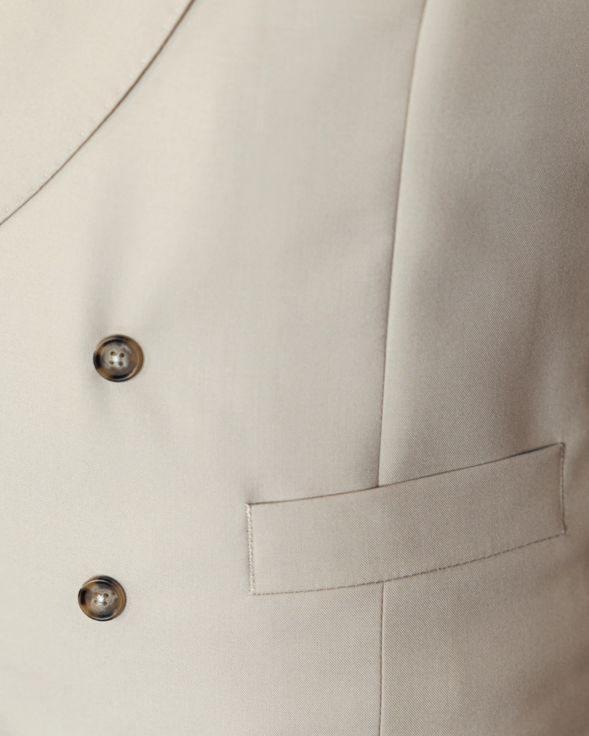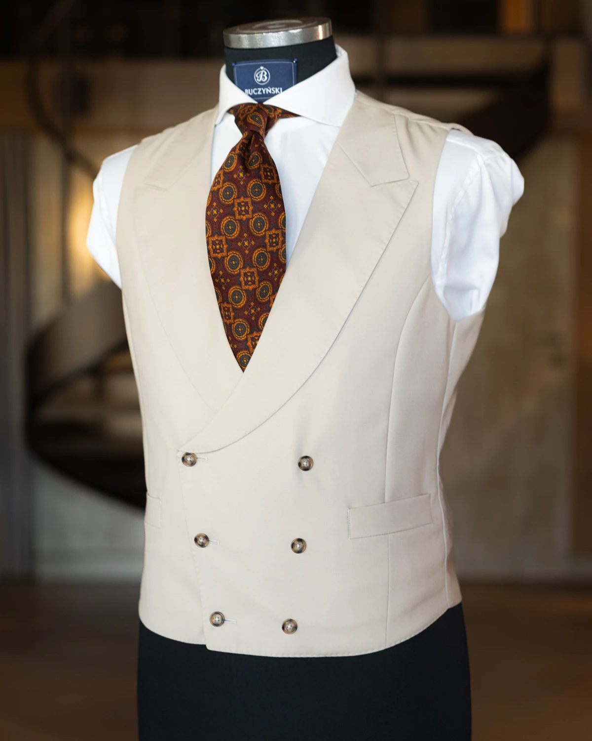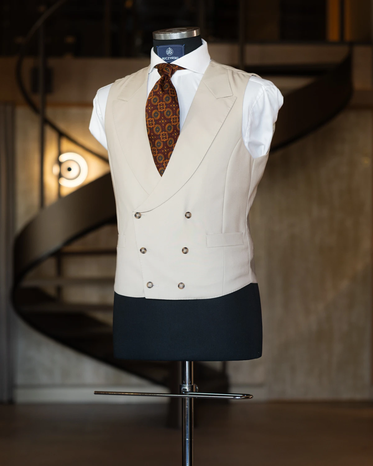 Do uszycia tych beżowych kamizelek dwurzędowych wykorzystaliśmy wełnę z tkalni Drago oraz wiskozową podszewkę. Taką kamizelkę dwurzędową z powodzeniem wykorzystasz w połączeniu z granatowym lub szarym garniturem, tak jak i ze smart-casualowymi, nieformalnymi marynarkami.