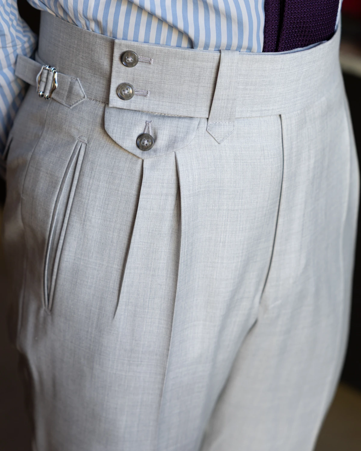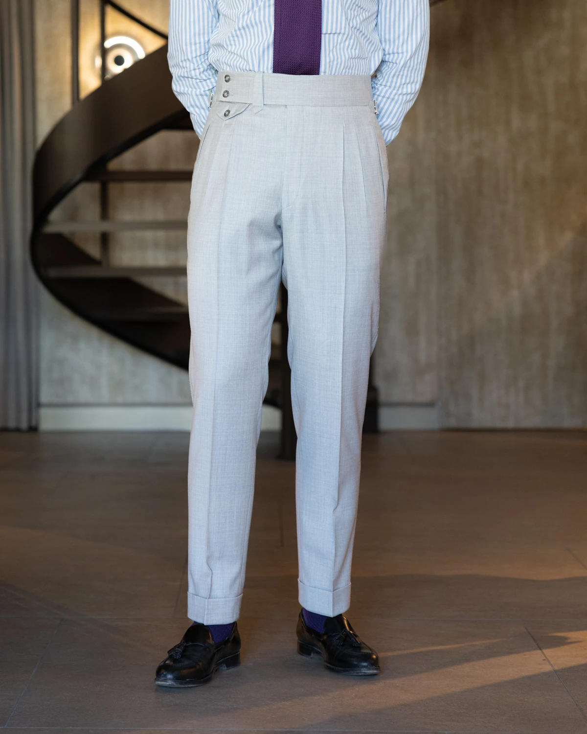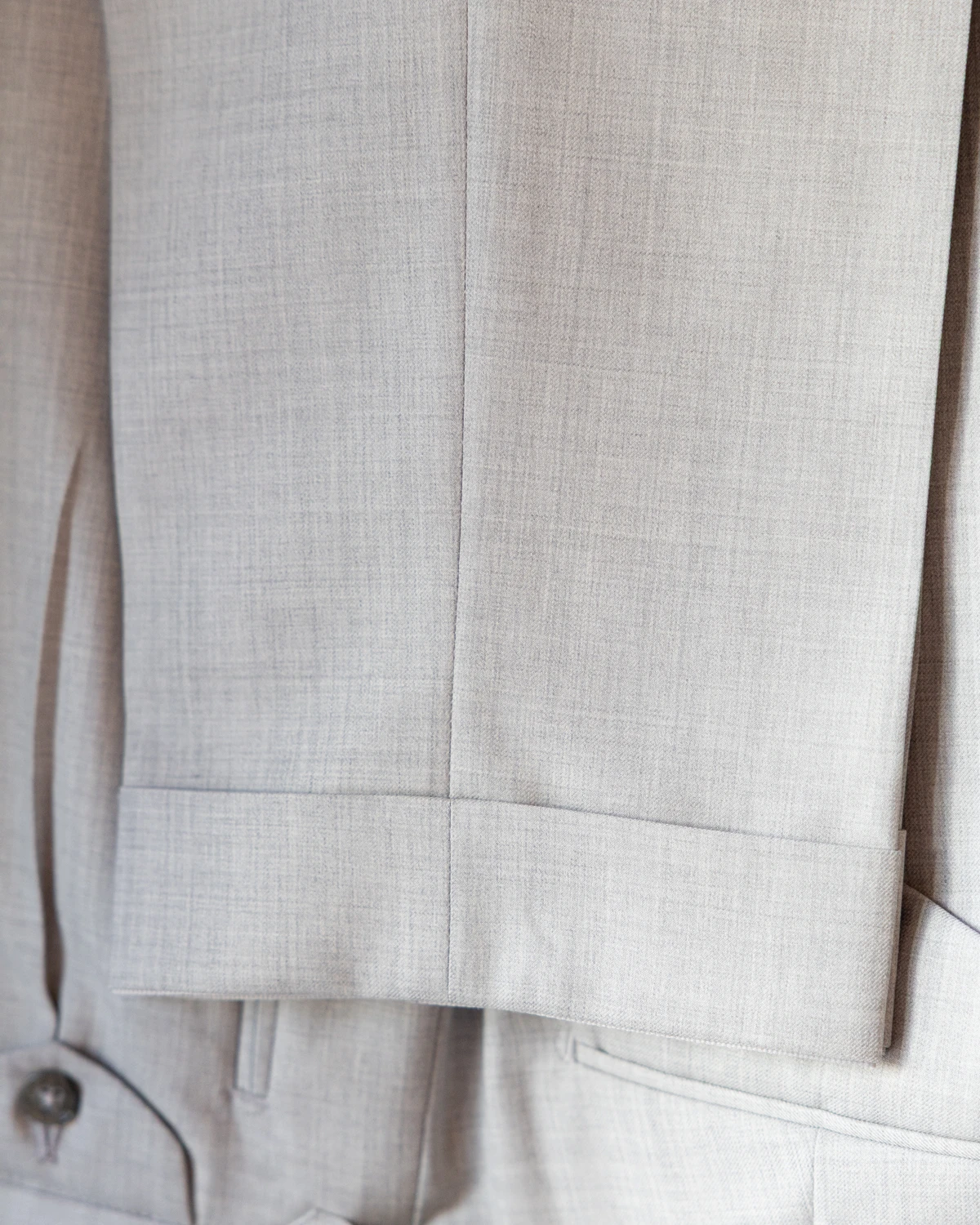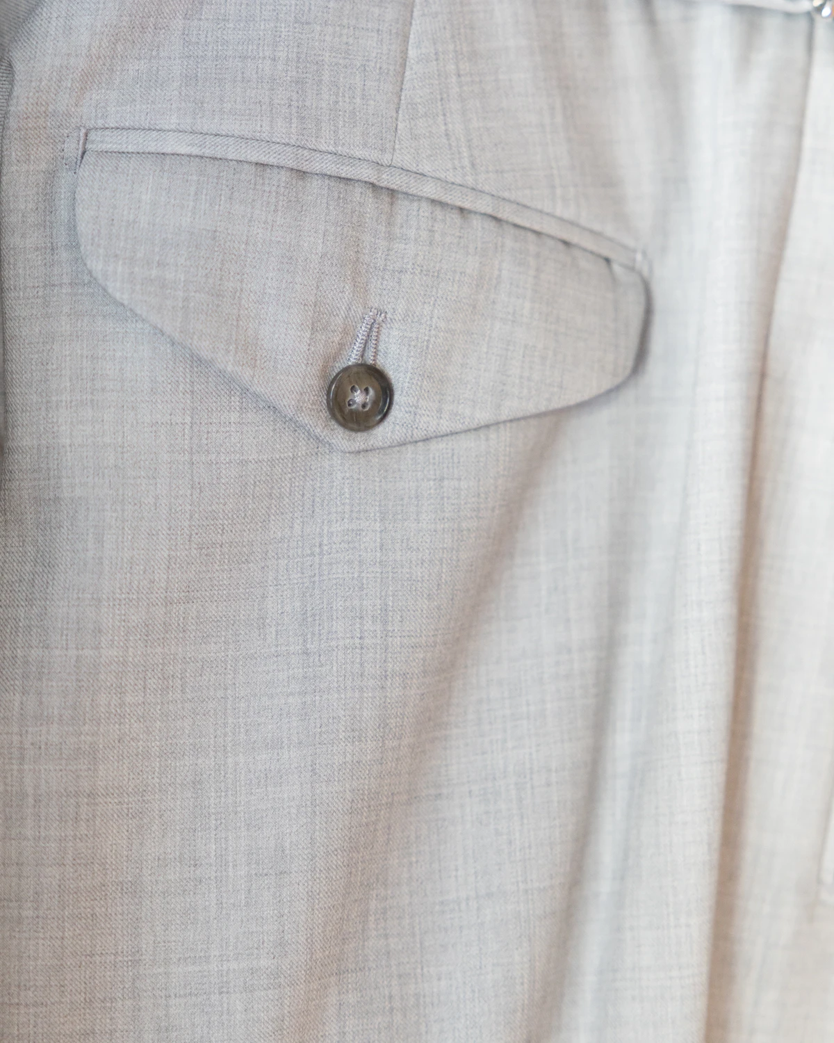 Do uszycia spodni wykorzystano wysokiej jakości wełnę od renomowanej tkalni Drago. Jasnoszary melanż z daleka prezentuje się jako jednolity, natomiast z bliska ujawnia swoją subtelną, zróżnicowaną strukturę, dodając tkaninie głębi i szlachetności.