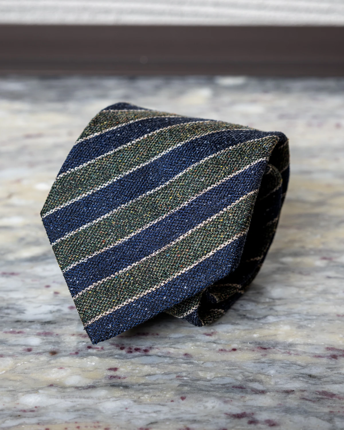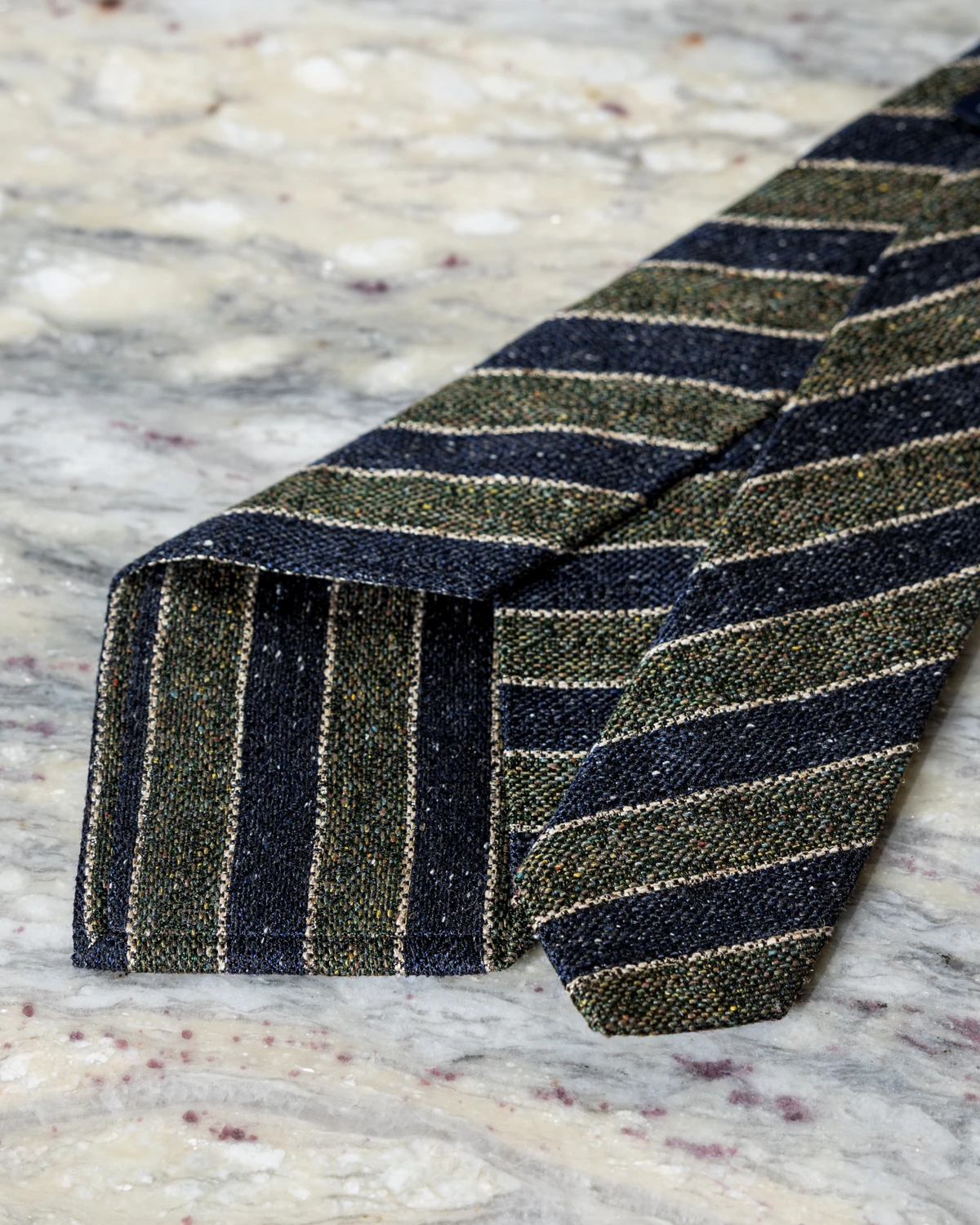 Jeżeli szukasz krawata, który łączy elegancję z nieco bardziej swobodnym charakterem, model jedwabno-lniany w granatowo-zielone pasy będzie strzałem w dziesiątkę. Połączenie klasycznego granatu z głęboką zielenią tworzy harmonijną i wyrafinowaną kompozycję, która wyróżnia się w subtelny sposób.