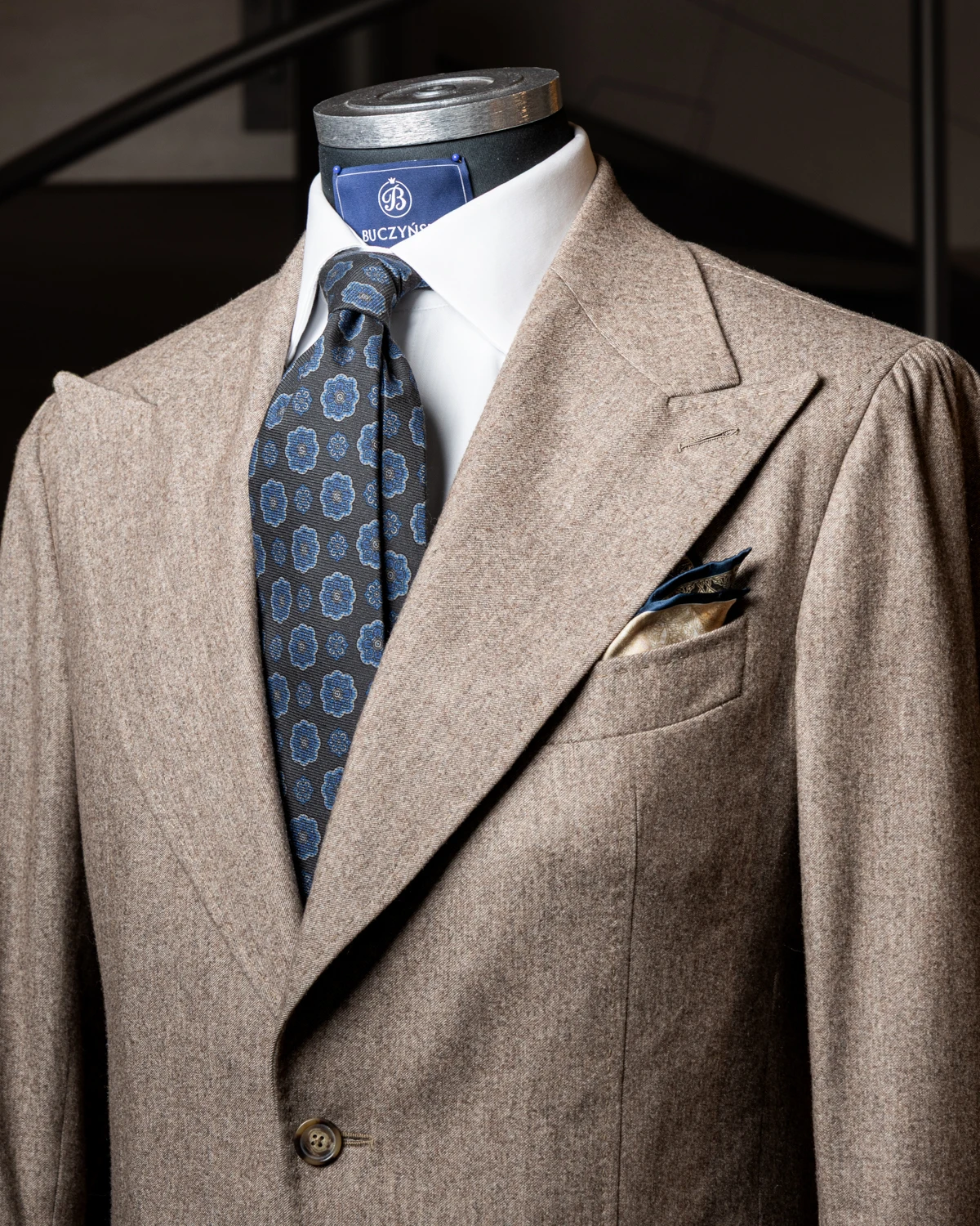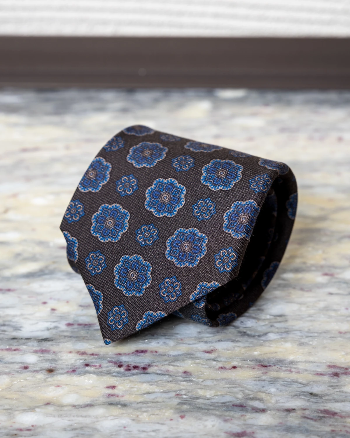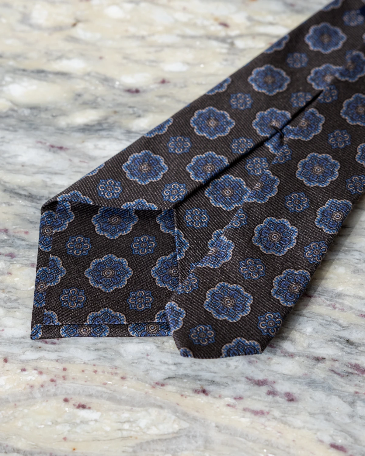 Nasz jedwabny brązowy krawat w duże niebieskie ornamenty doda stylizacji wyrazistego, ale wciąż eleganckiego akcentu. Ciepła, głęboka baza tworzy doskonałe tło dla kontrastowego wzoru, który przyciąga uwagę i nadaje całości charakteru, nie odbierając jej klasy.