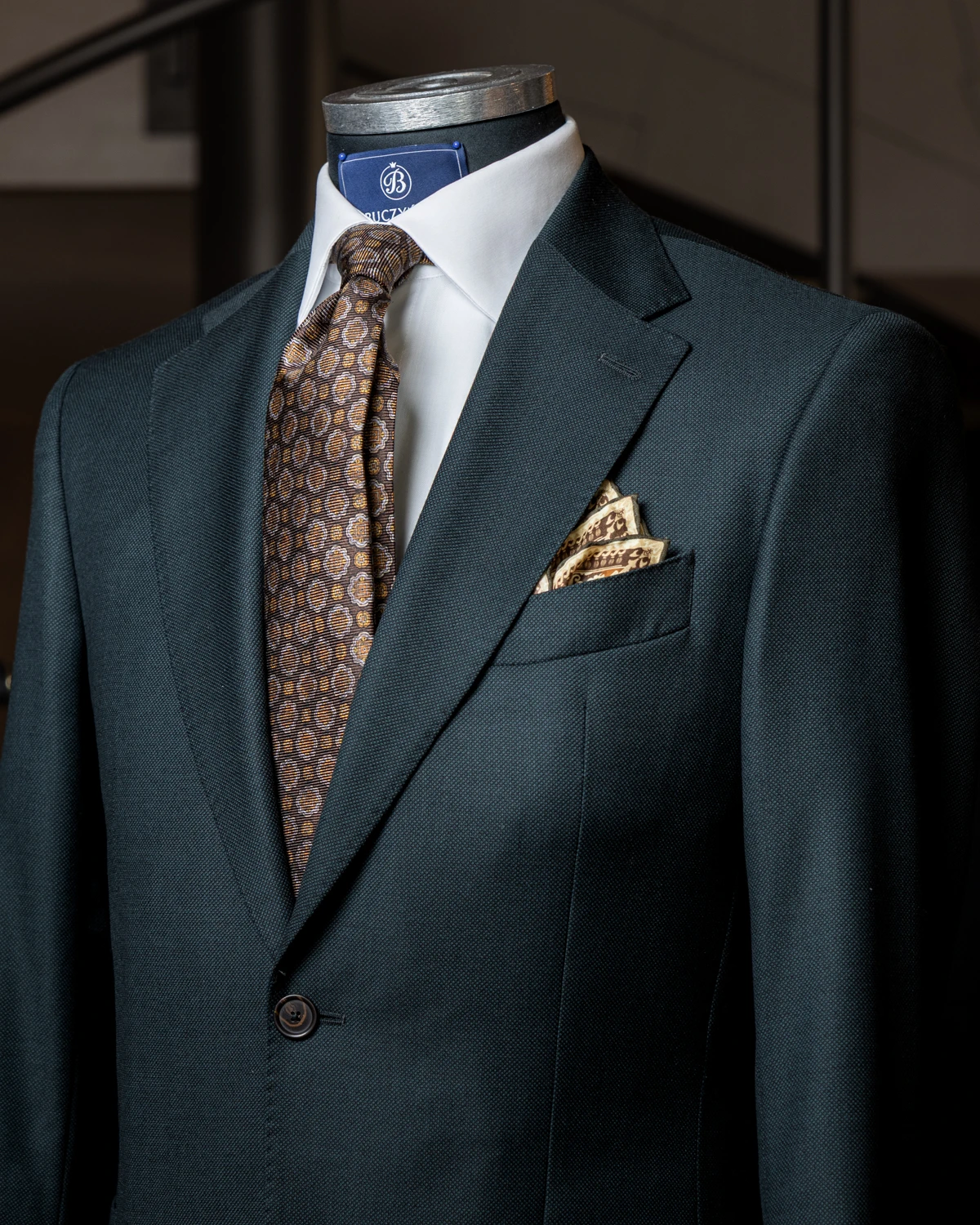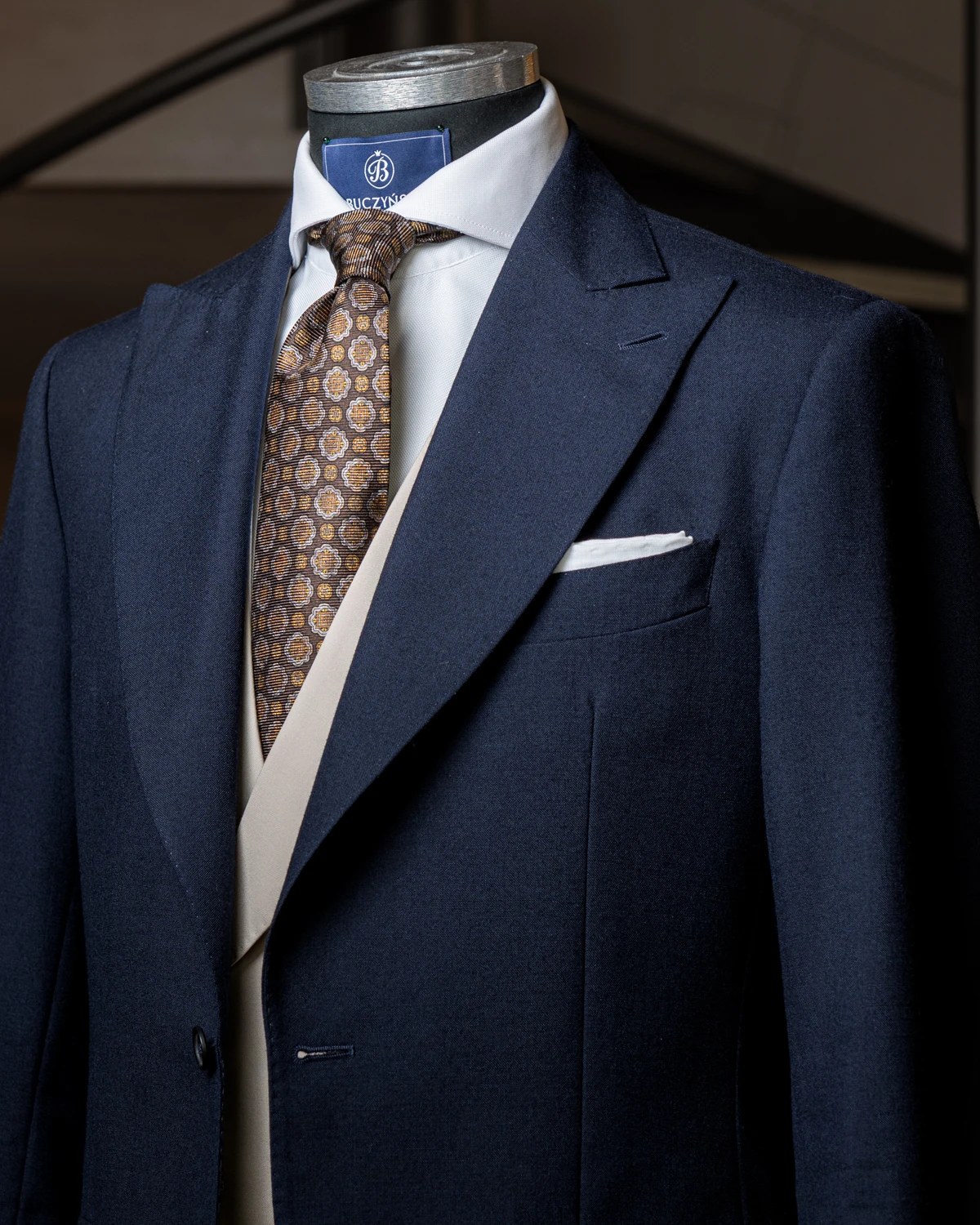 Krawat został uszyty w Polsce z wysokiej jakości włoskiego jedwabiu o subtelnym połysku. Odpowiednio dobrany wkład zapewnia estetyczne układanie się węzła, a klasyczne proporcje – ok. 150 cm długości i 9,5 cm szerokości – sprawiają, że model pasuje do większości typów sylwetki oraz marynarek o tradycyjnej szerokości klap.