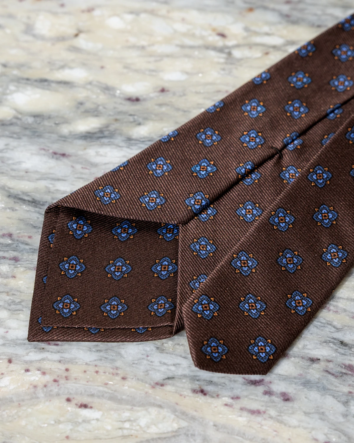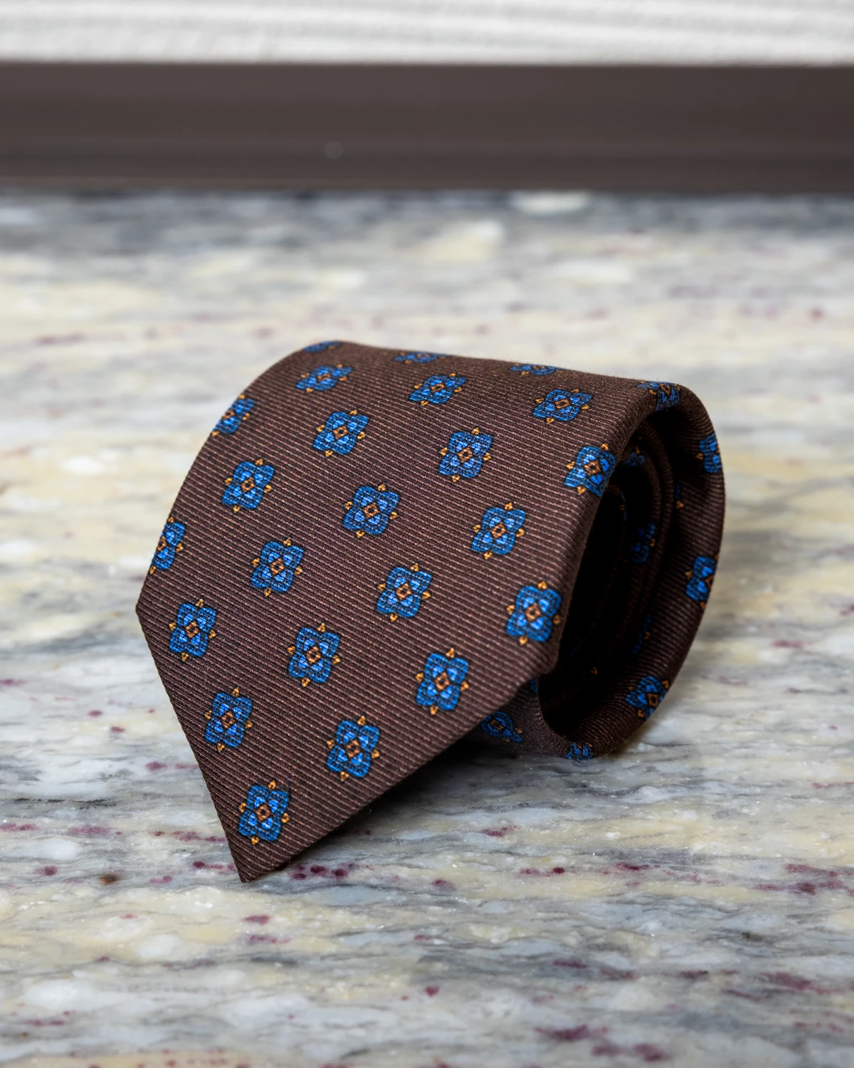 Brąz to kolor ciepły, elegancki i niezwykle uniwersalny. Nic więc dziwnego, że jedwabny krawat w odcieniu brązu z niebieskimi ornamentami tak dobrze odnajduje się w męskiej garderobie. Połączenie głębokiej, stonowanej bazy z chłodniejszymi akcentami sprawia, że krawat nie tylko pasuje do wielu zestawów, ale też w subtelny sposób je ożywia i nadaje im charakteru.