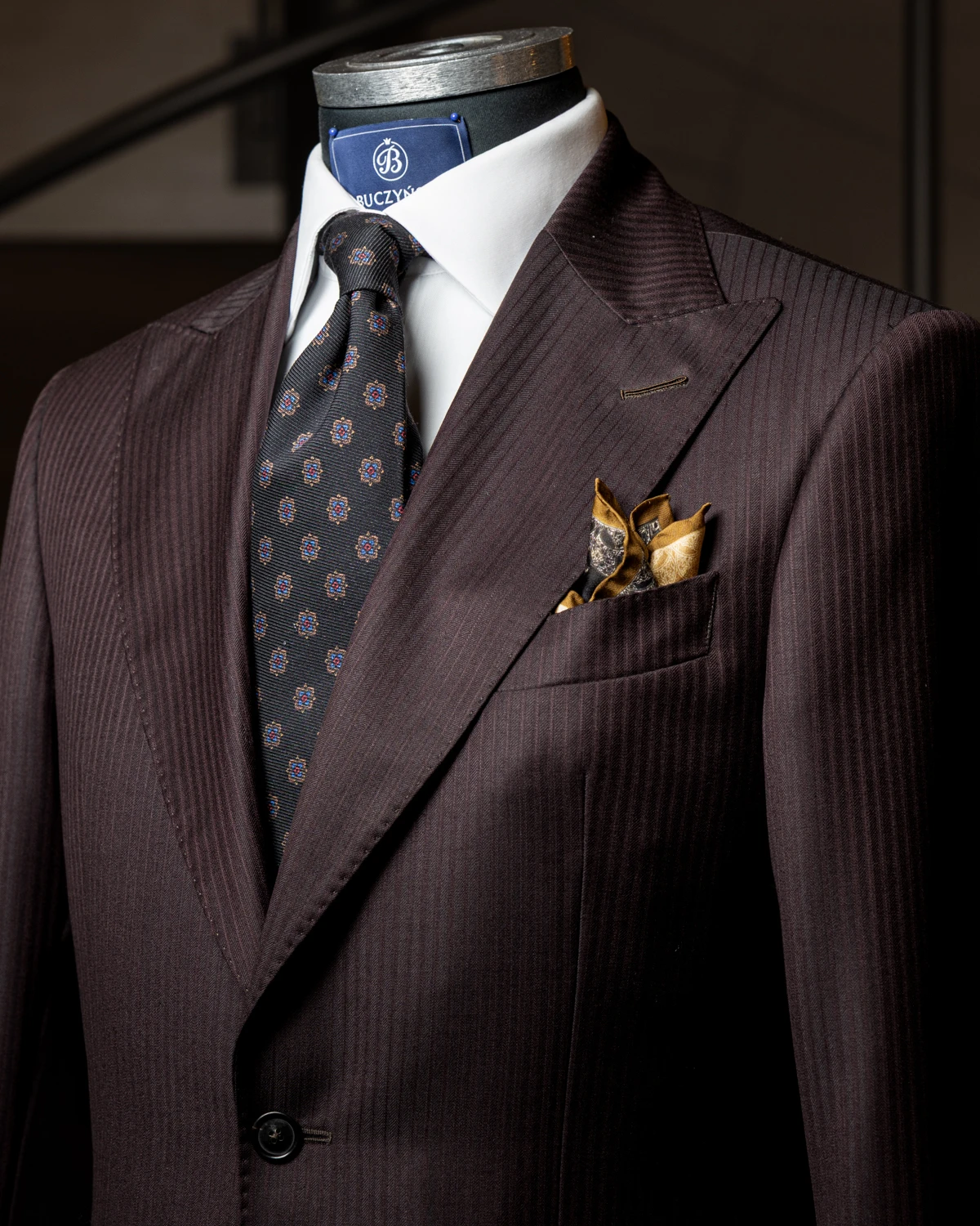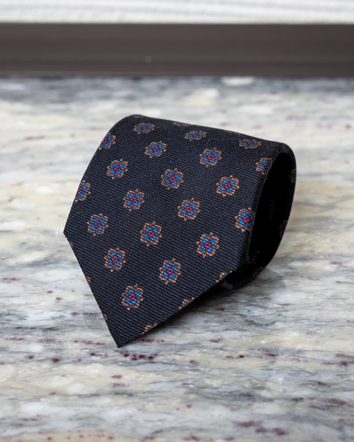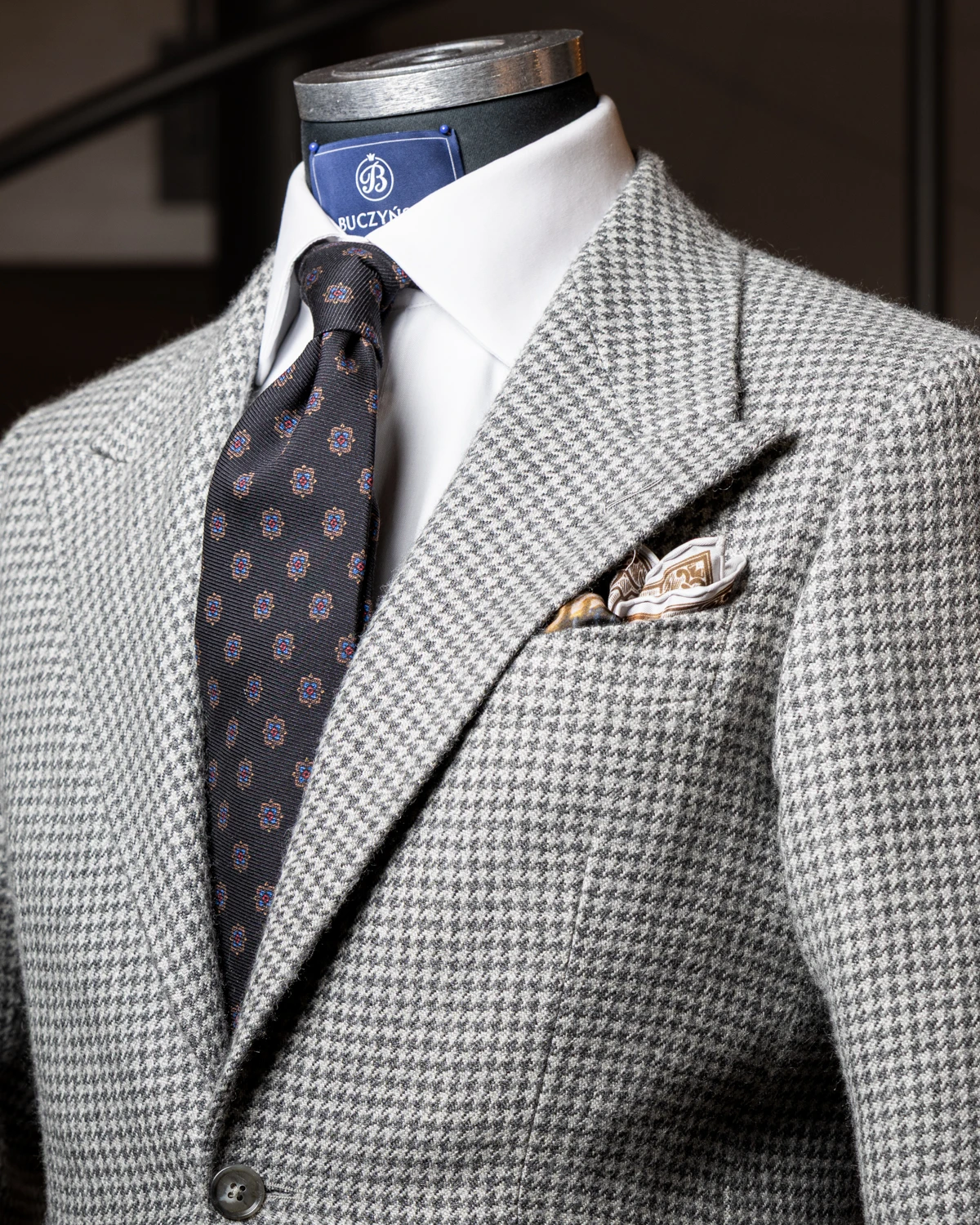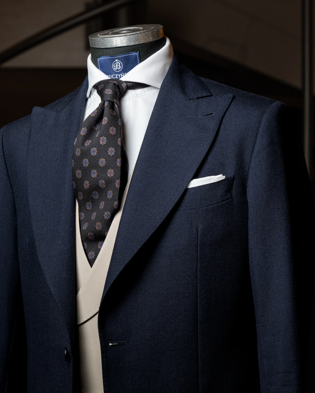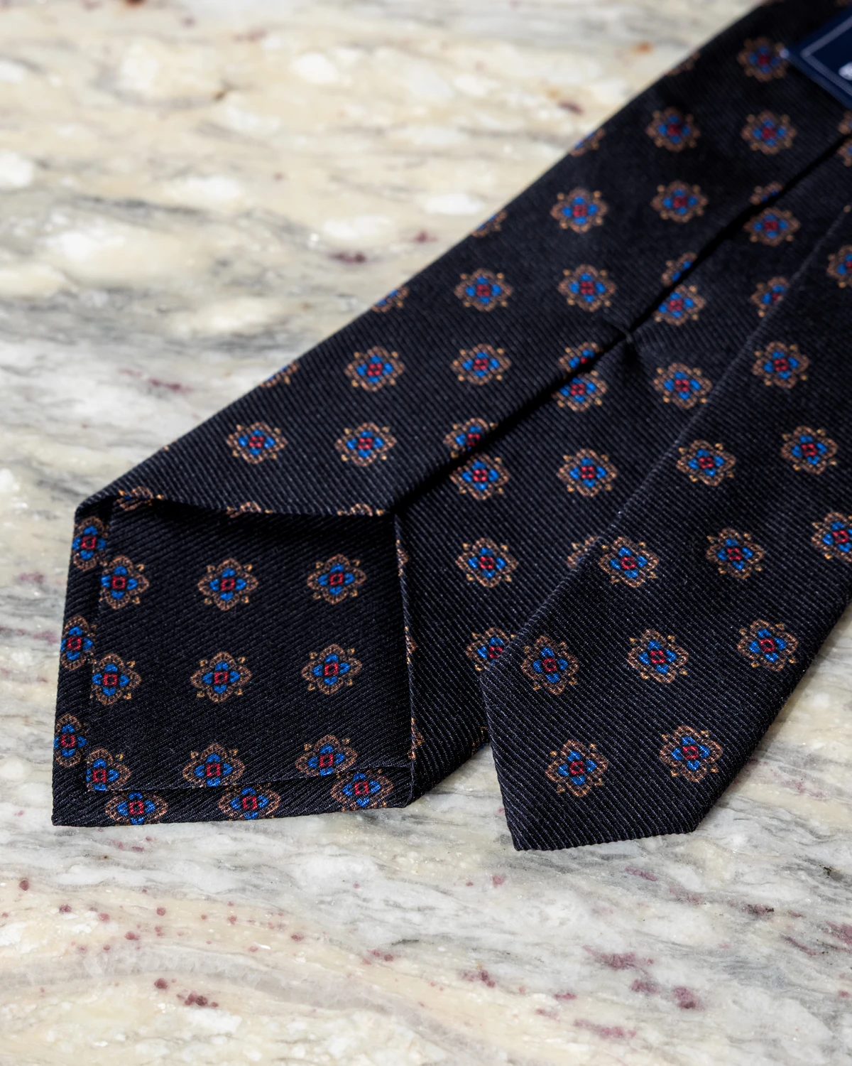 Średniej wielkości ornamenty sprawiają, że krawat zachowuje elegancki charakter, ale jednocześnie zyskuje wyrazistość. To świetny wybór zarówno do formalnych stylizacji, jak i tych nieco mniej zobowiązujących, gdzie chcesz dodać czerni odrobiny charakteru. Dobrze komponuje się z szarością, granatem, a nawet ciemną zielenią, tworząc spójne i stylowe zestawy.