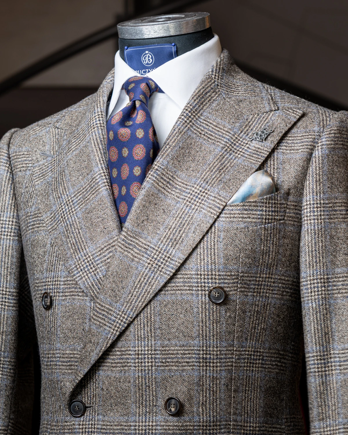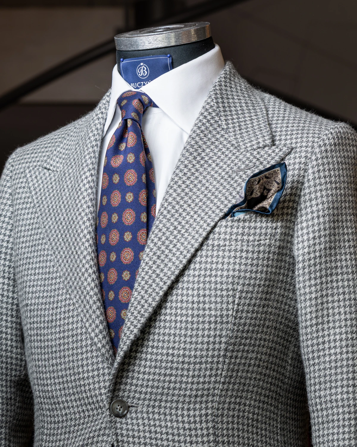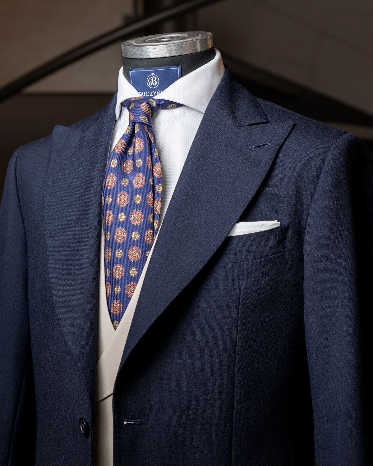 Okrągłe ornamenty wprowadzają subtelną dynamikę i sprawiają, że krawat prezentuje się interesująco zarówno z bliska, jak i w całym zestawie. Niebieski kolor jest bardzo uniwersalny – dobrze komponuje się z granatem, szarością, brązem czy beżem, a także z białą lub błękitną koszulą. To sprawia, że krawat łatwo dopasować do wielu stylizacji, od biznesowych po mniej formalne.