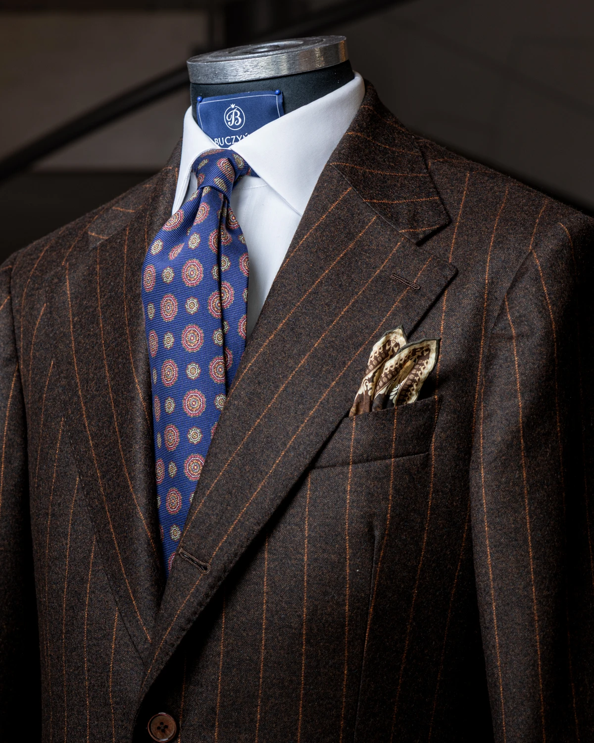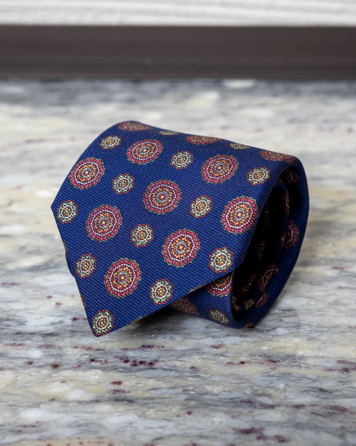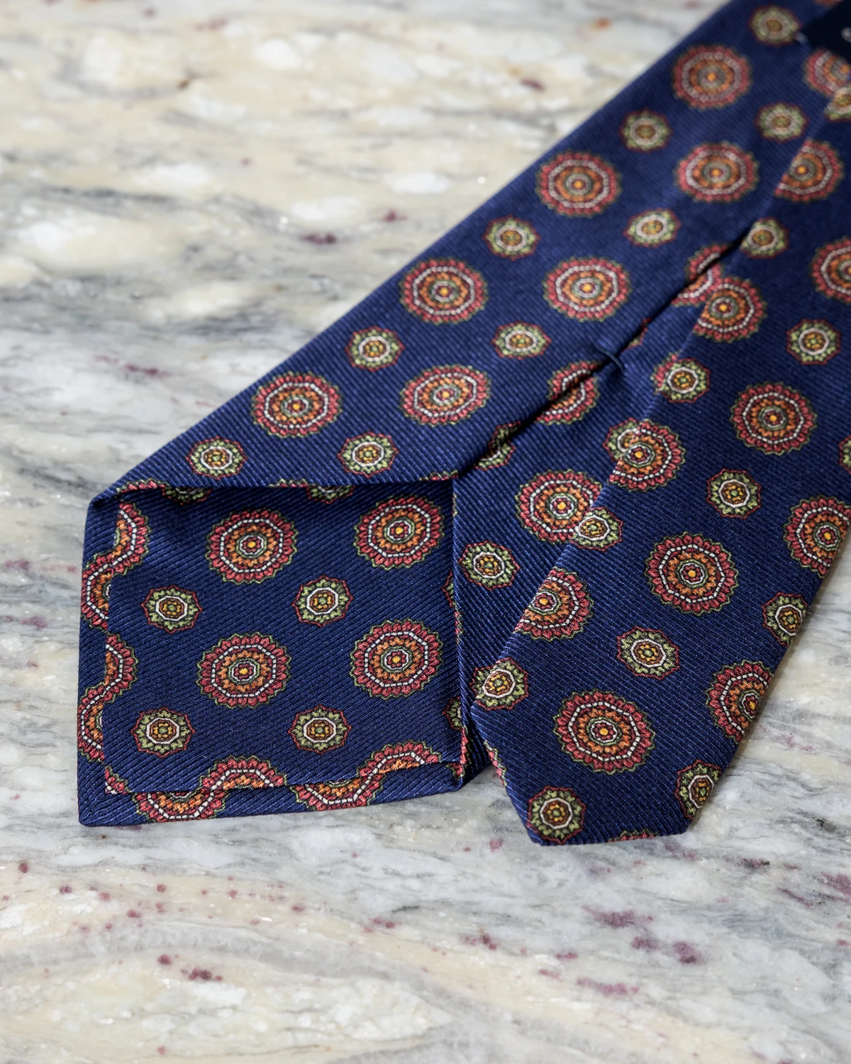 Okrągłe ornamenty wprowadzają subtelną dynamikę i sprawiają, że krawat prezentuje się interesująco zarówno z bliska, jak i w całym zestawie. Niebieski kolor jest bardzo uniwersalny – dobrze komponuje się z granatem, szarością, brązem czy beżem, a także z białą lub błękitną koszulą. To sprawia, że krawat łatwo dopasować do wielu stylizacji, od biznesowych po mniej formalne.