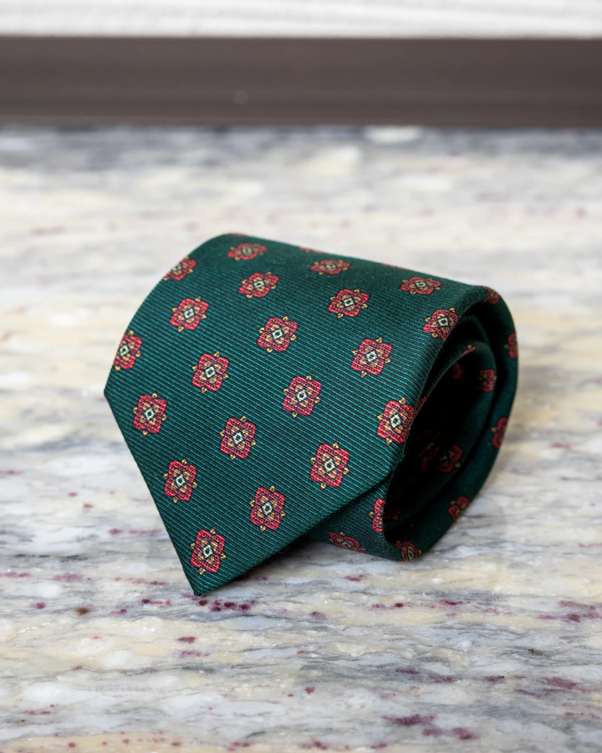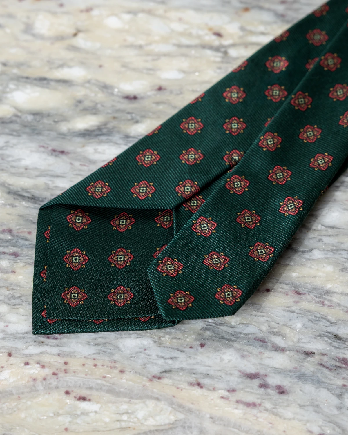 Butelkowa zieleń jest kolorem pięknym, głębokim i pożądanym. Nic dziwnego, że butelkowozielony krawat jedwabny w czerwone ornamenty cieszy się tak dużą popularnością. Nie dość, że świetnie współgra z wieloma garniturami i koszulami, to jeszcze w znaczący sposób urozmaica każdą stylizację, nadając jej dodatkowego sznytu.