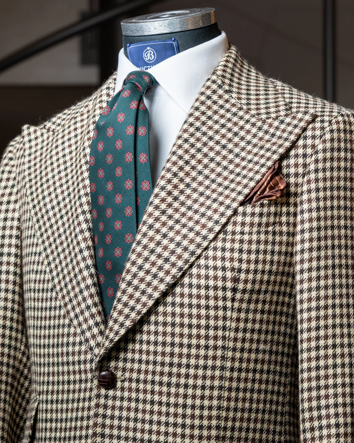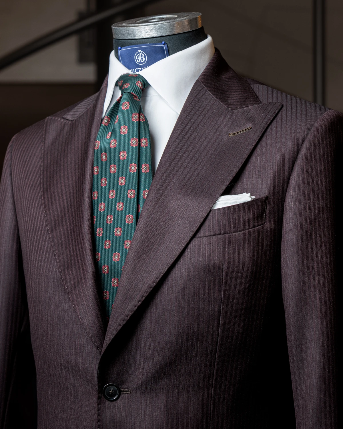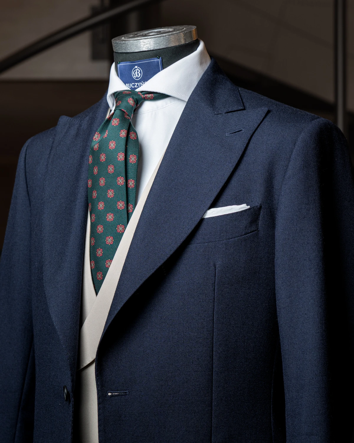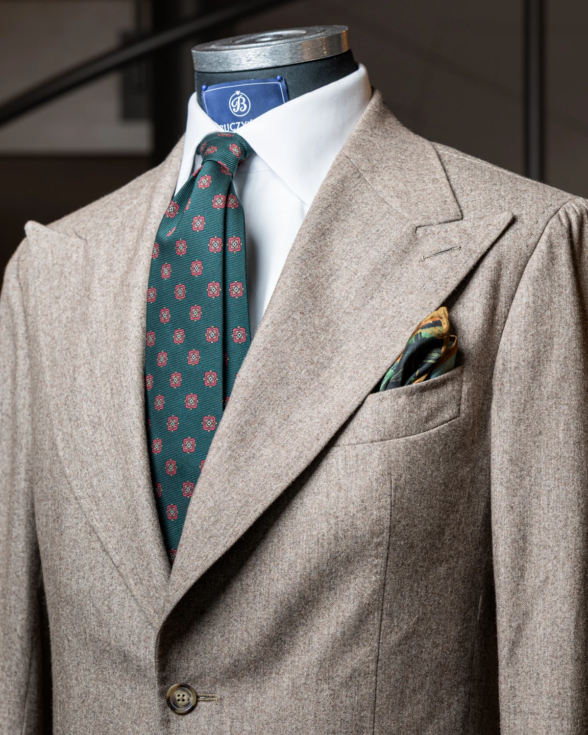 Zielony krawat jedwabny w ornamenty jest akcesorium, które po zawiązaniu zawsze znajduje się blisko twarzy. Zadbaliśmy o to, aby nie rozpraszało uwagi, tylko uzupełniało charakter osoby noszącej. Przede wszystkim dzięki indywidualnie dobranemu wkładowi krawat świetnie się wiąże – węzeł jest elegancki i mięsisty. Sam wzór jest subtelny, ale zauważalny, co zdecydowanie działa w tym przypadku na plus.