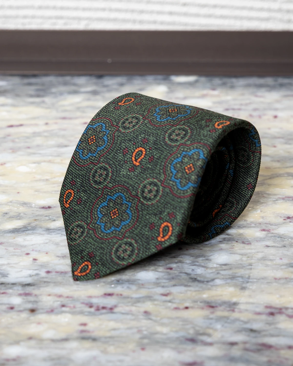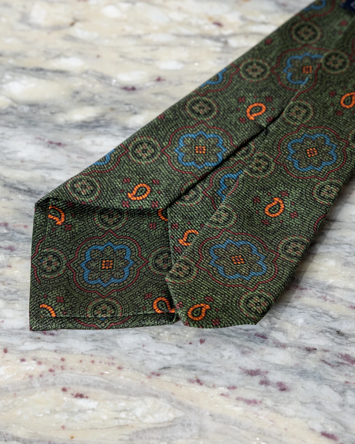 Duży ornamentowy wzór nadaje krawatowi szlachetnego, lekko retro charakteru i sprawia, że prezentuje się efektownie zarówno w stylizacjach biznesowych, jak i bardziej swobodnych zestawach smart casual. Zieleń doskonale łączy się z granatem, brązem czy beżem, a w zestawieniu z białą lub błękitną koszulą tworzy elegancki, spójny zestaw.