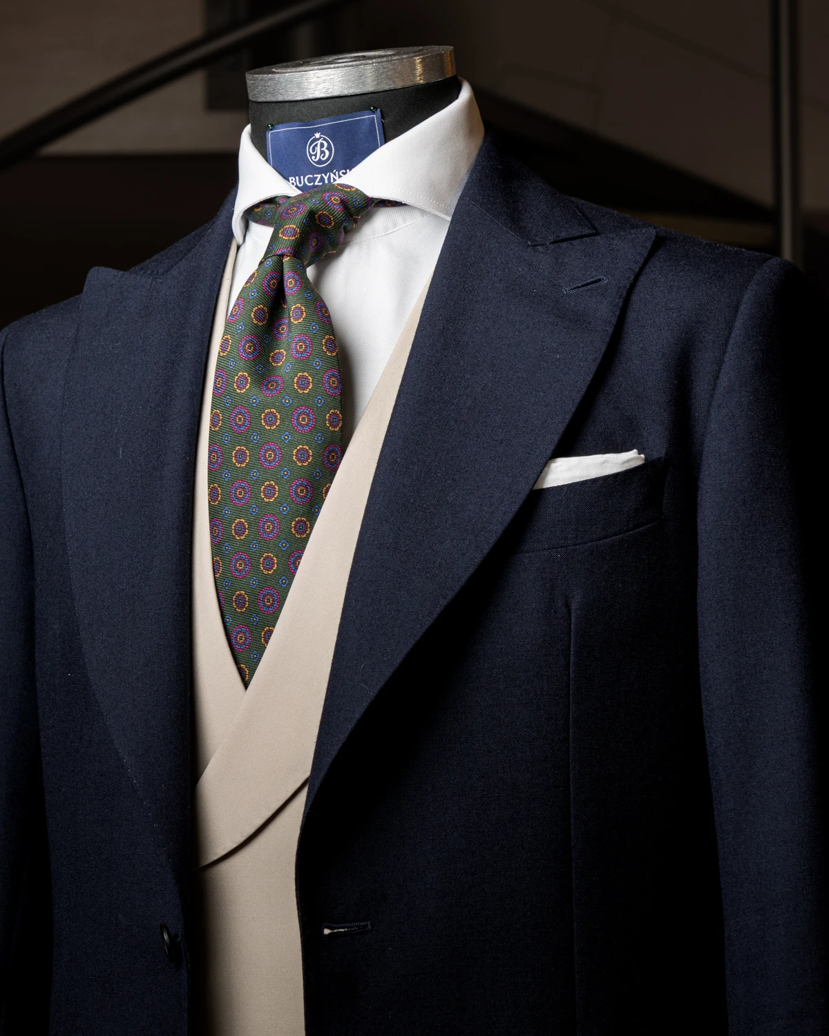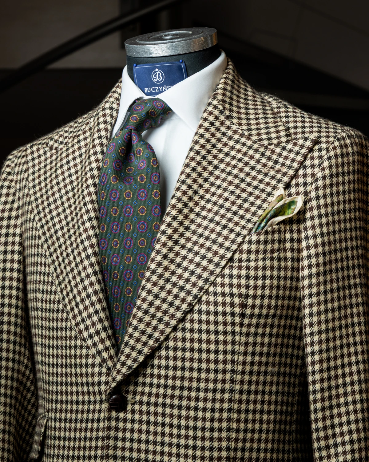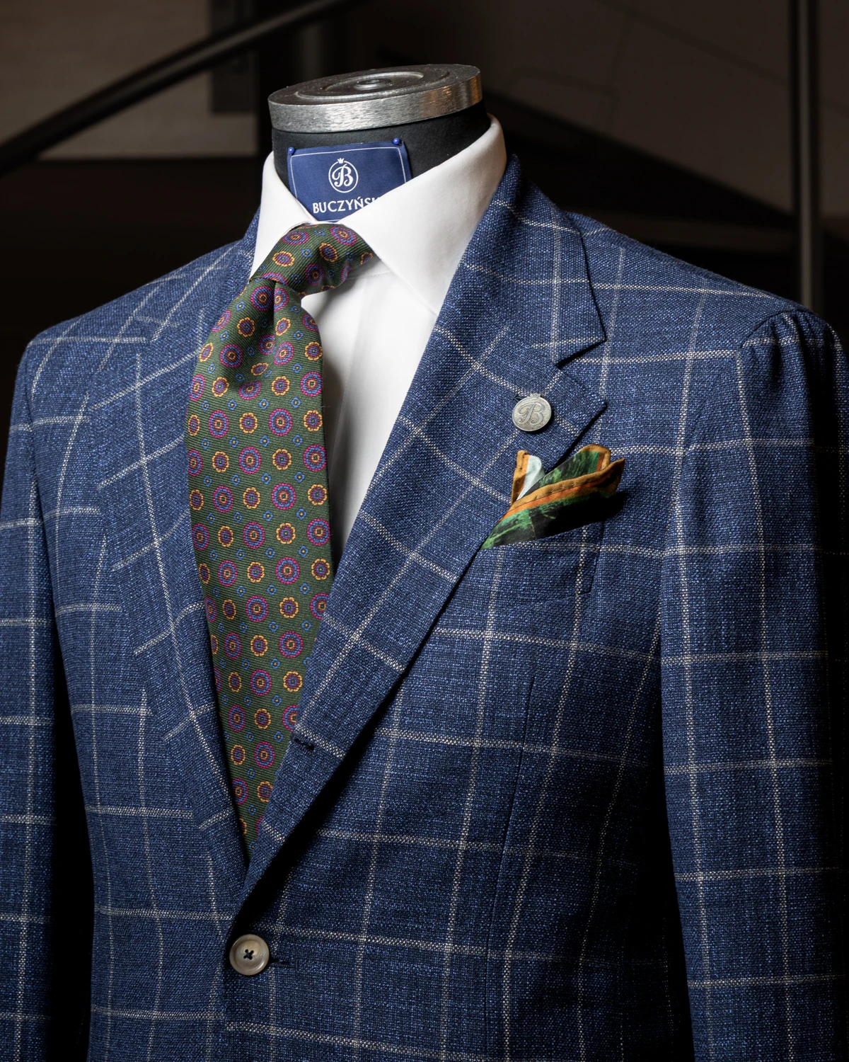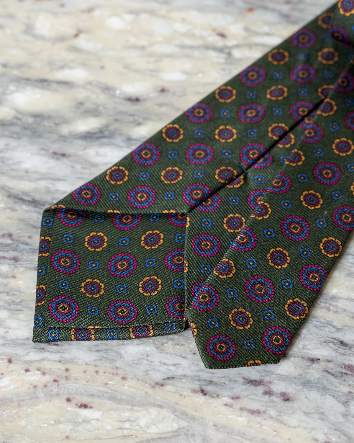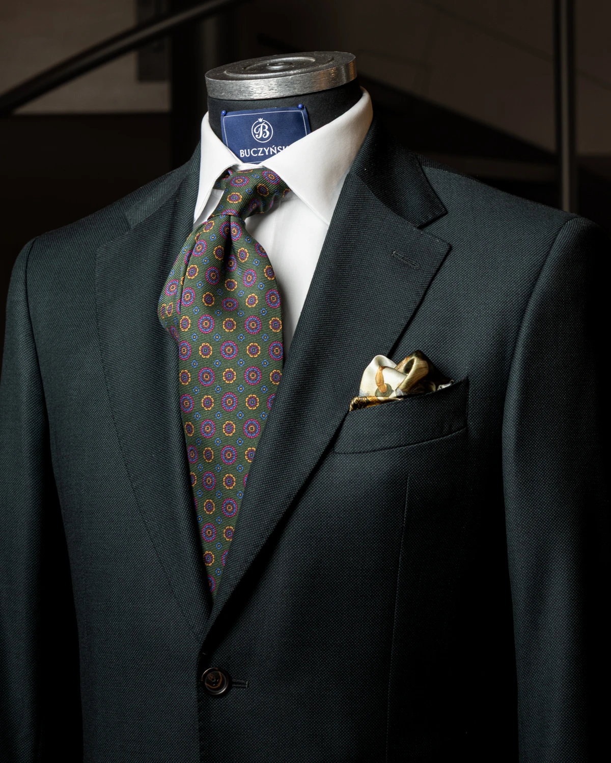 Kwiatowy wzór sprawia, że krawat świetnie pasuje zarówno do stylizacji biznesowych, jak i smart casual. Zielona baza łatwo łączy się z granatem, szarością czy beżem, ale także z wieloma deseniami marynarek, na przykład pepitą.