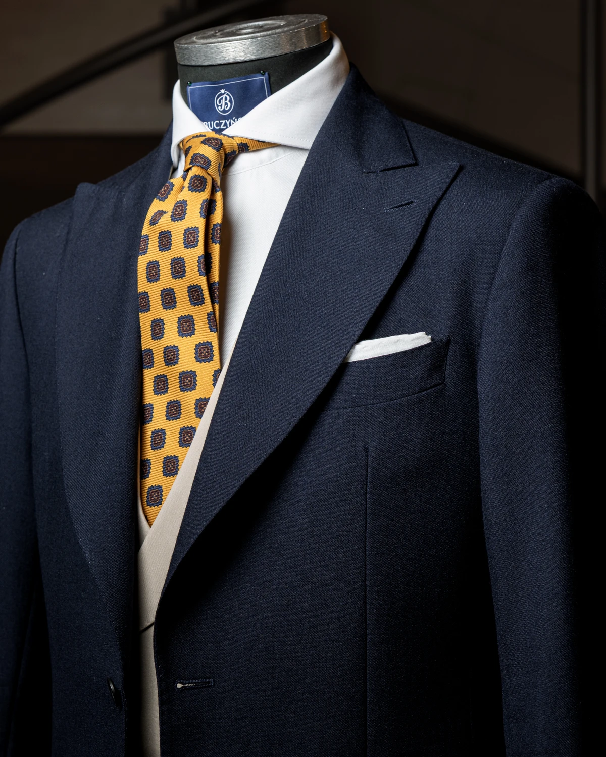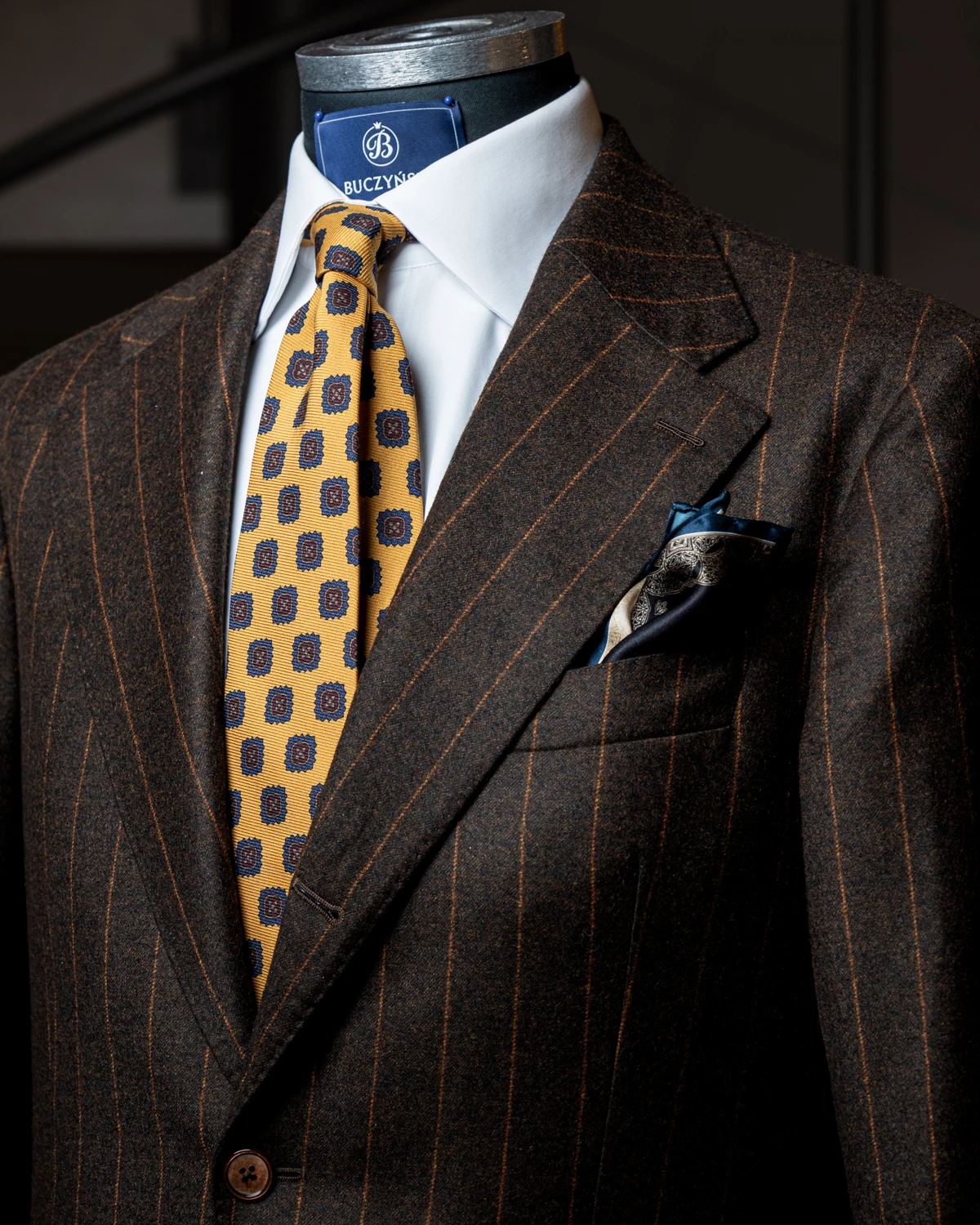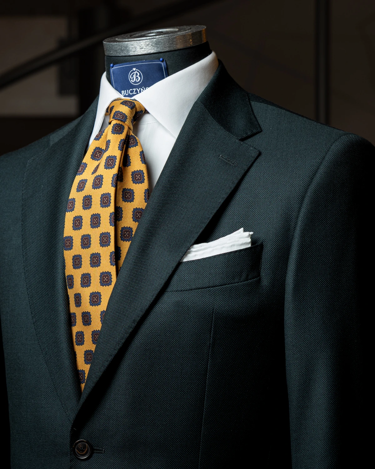 Regularny, kwadratowy deseń wprowadza do krawata subtelną dynamikę i sprawia, że model dobrze odnajduje się zarówno w stylizacjach biznesowych, jak i smart casual. Żółta baza świetnie współgra z granatem, szarością i brązem, a także z koszulami białymi, błękitnymi oraz w delikatne prążki, pozwalając tworzyć eleganckie, a jednocześnie nieszablonowe zestawy.