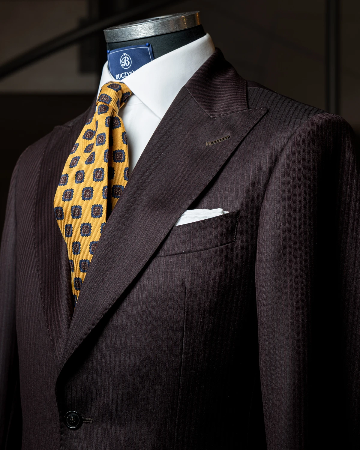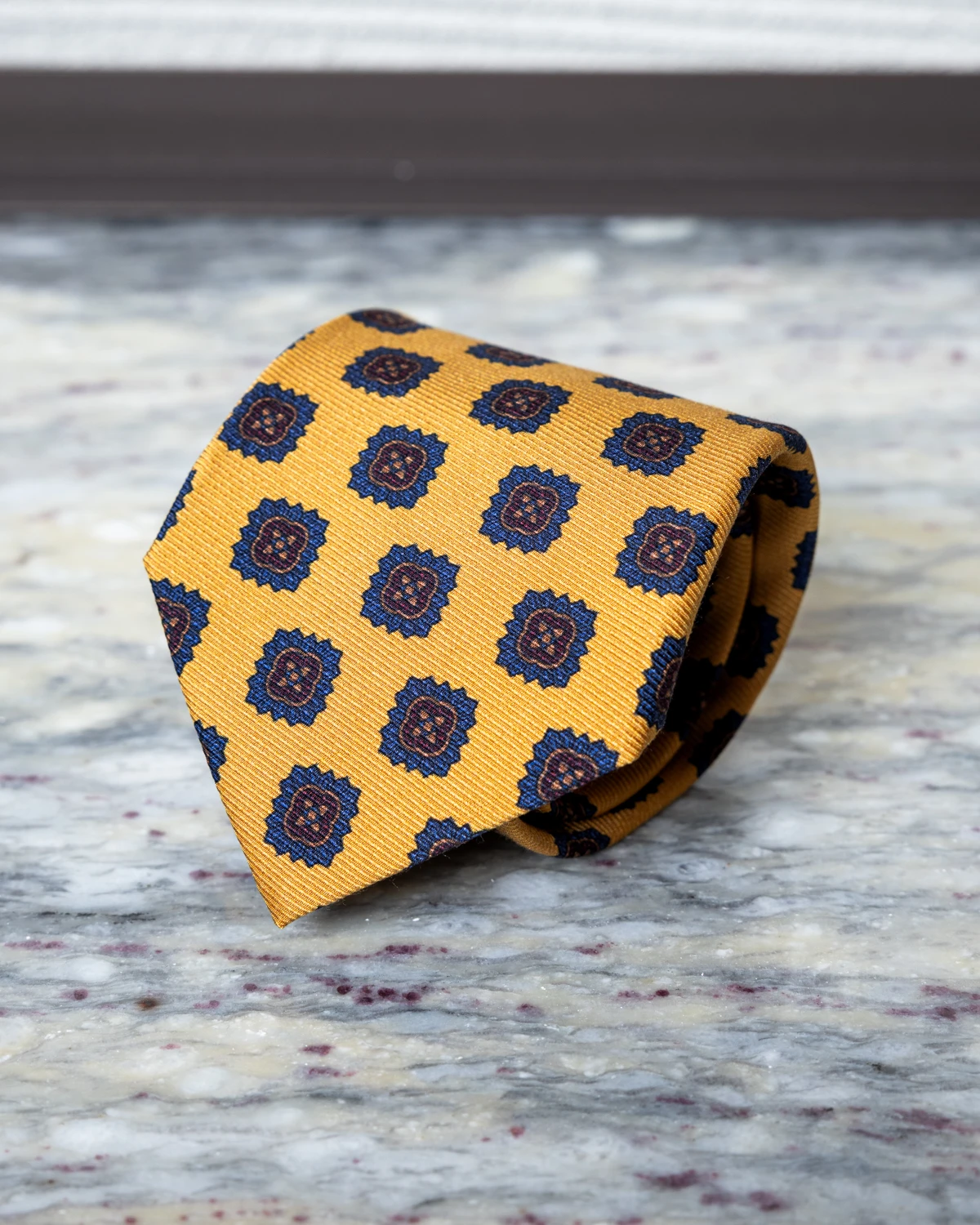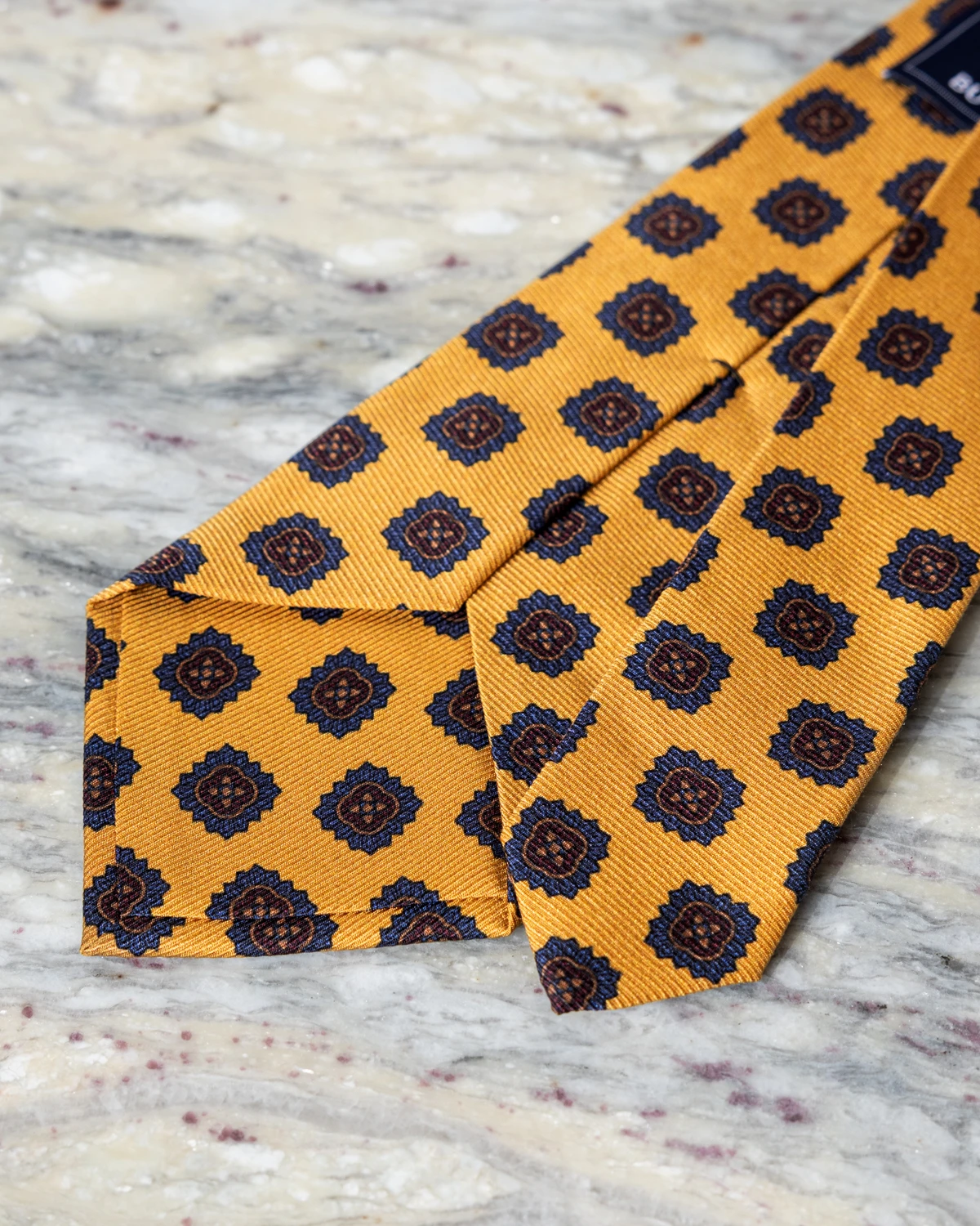 Regularny, kwadratowy deseń wprowadza do krawata subtelną dynamikę i sprawia, że model dobrze odnajduje się zarówno w stylizacjach biznesowych, jak i smart casual. Żółta baza świetnie współgra z granatem, szarością i brązem, a także z koszulami białymi, błękitnymi oraz w delikatne prążki, pozwalając tworzyć eleganckie, a jednocześnie nieszablonowe zestawy.