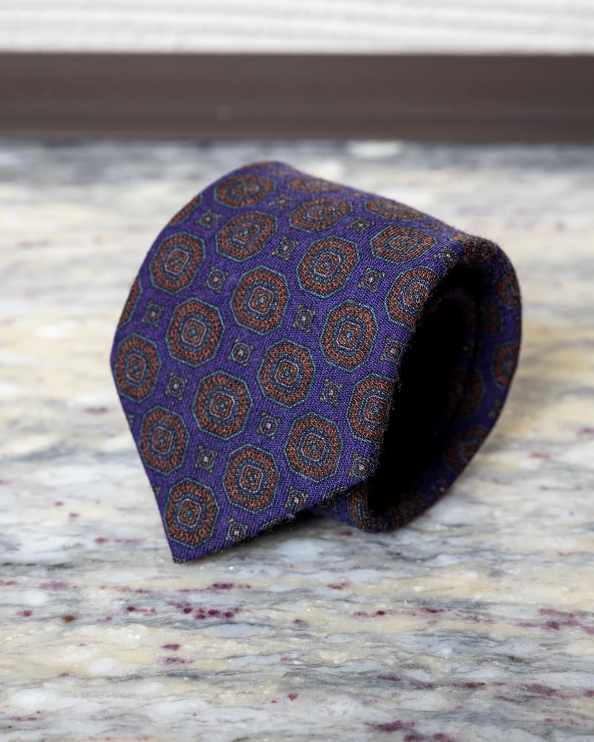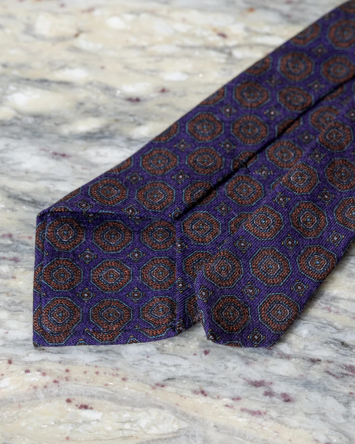 Krawat wełniany fioletowy w pomarańczowe ornamenty
