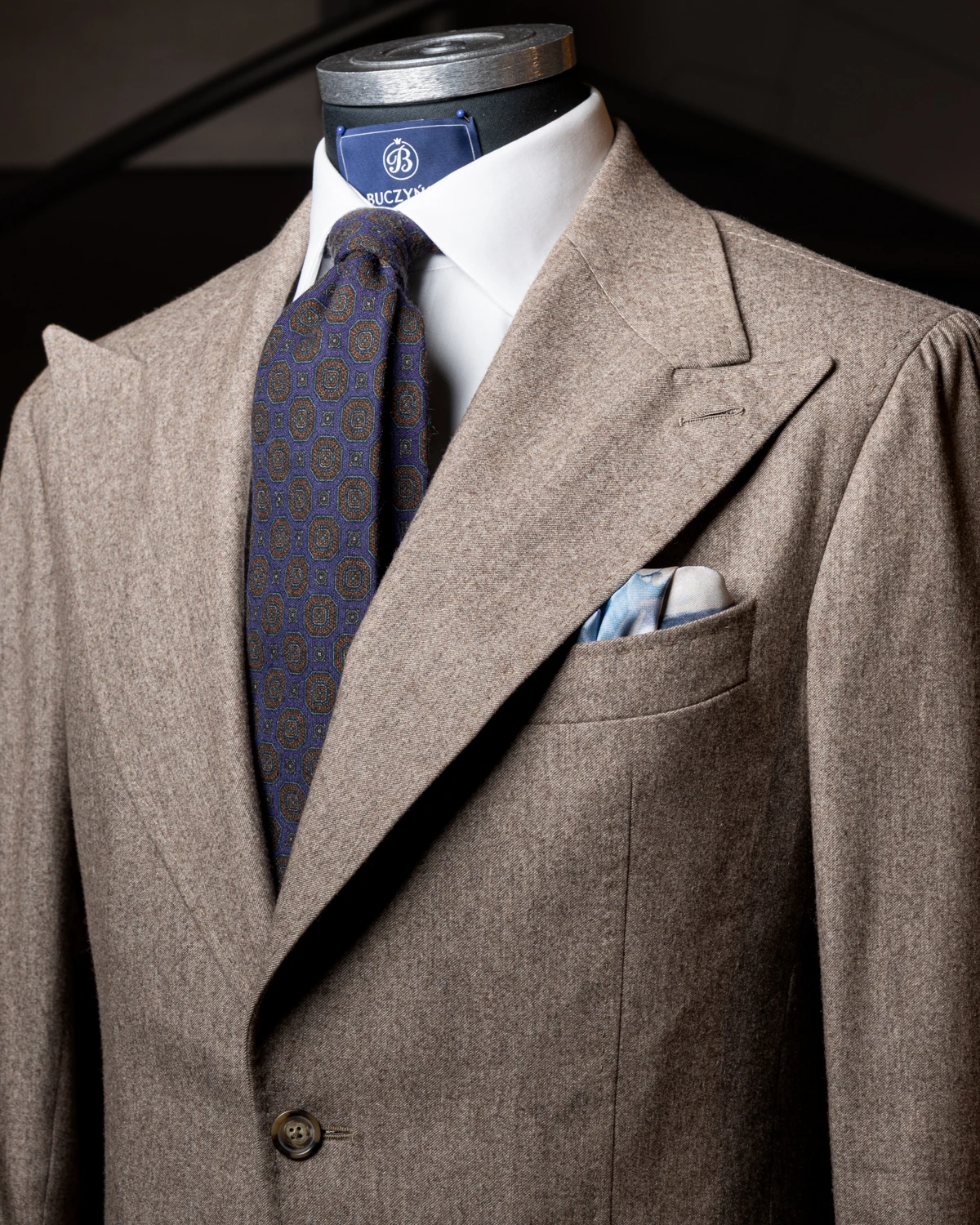 Krawat został uszyty ręcznie w manufakturze w Polsce. Do produkcji wykorzystaliśmy wełnę o subtelnej fakturze, a wkład dopasowaliśmy indywidualnie do grubości materiału.
