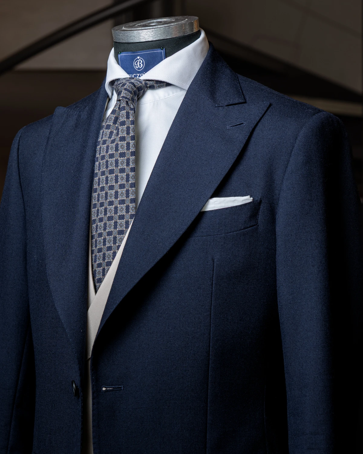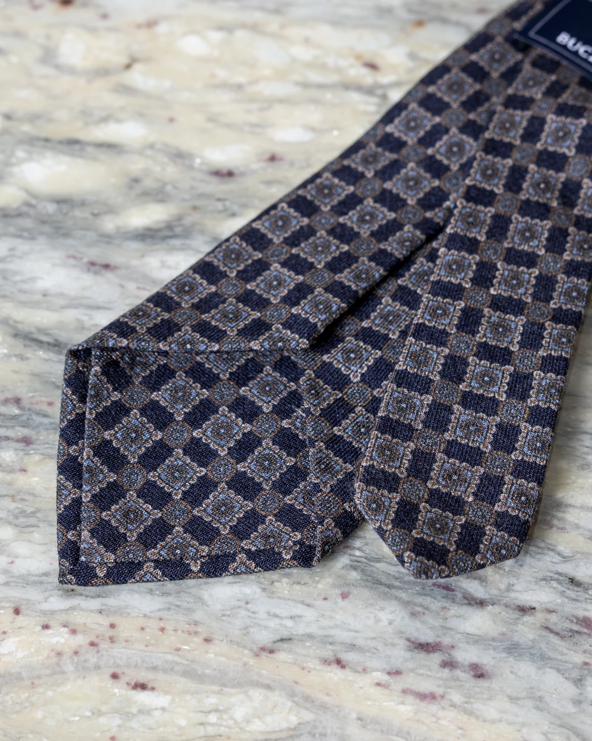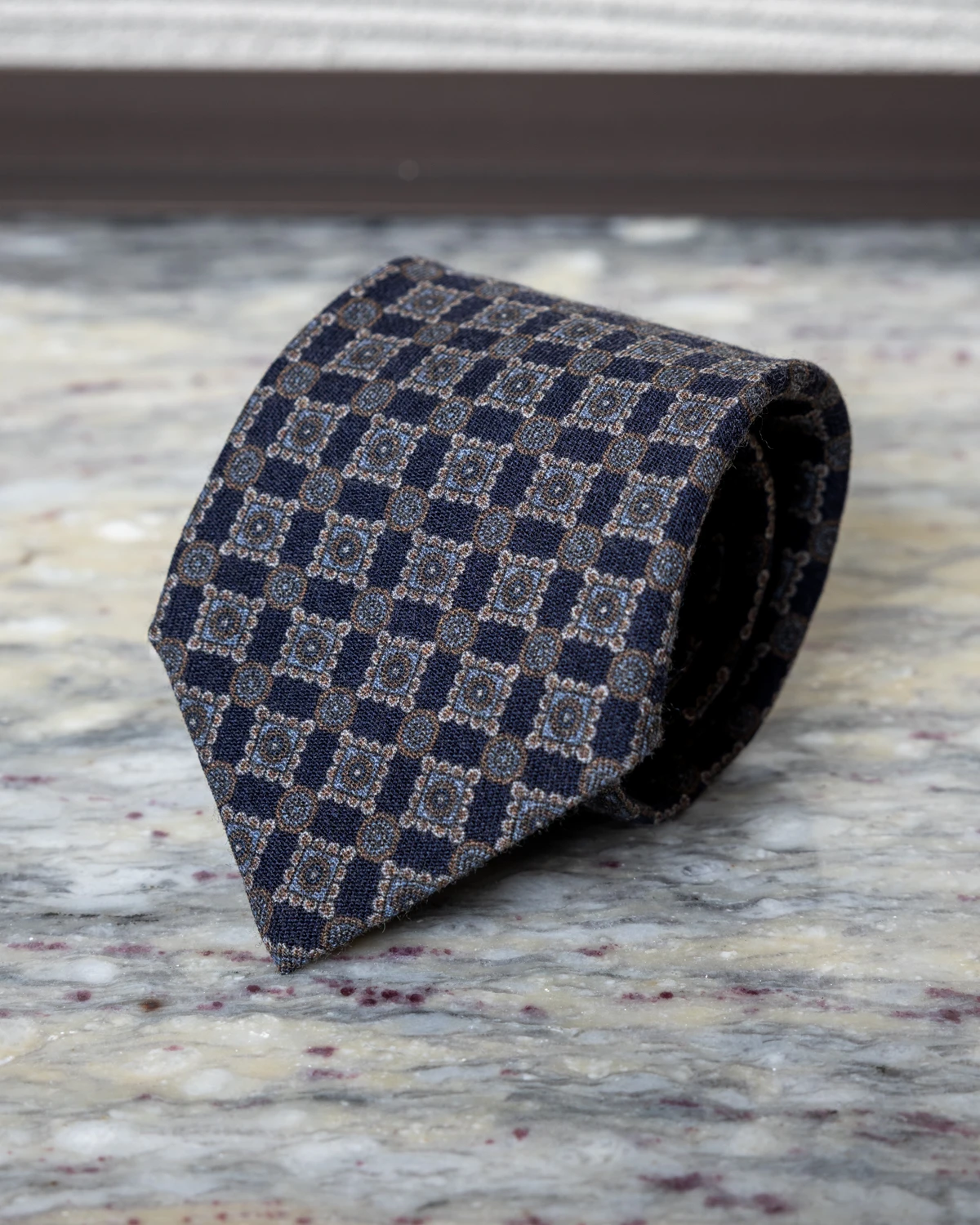 Drobne ornamenty wprowadzają nutę wyrafinowania, nie przytłaczając stylizacji, dzięki czemu krawat z łatwością odnajduje się nie tylko w zestawach półformalnych, ale także tych biznesowych. Granatowa baza i stonowane ornamenty sprawiają, że model bardzo dobrze komponuje się m.in. z szarością, brązem i beżem.