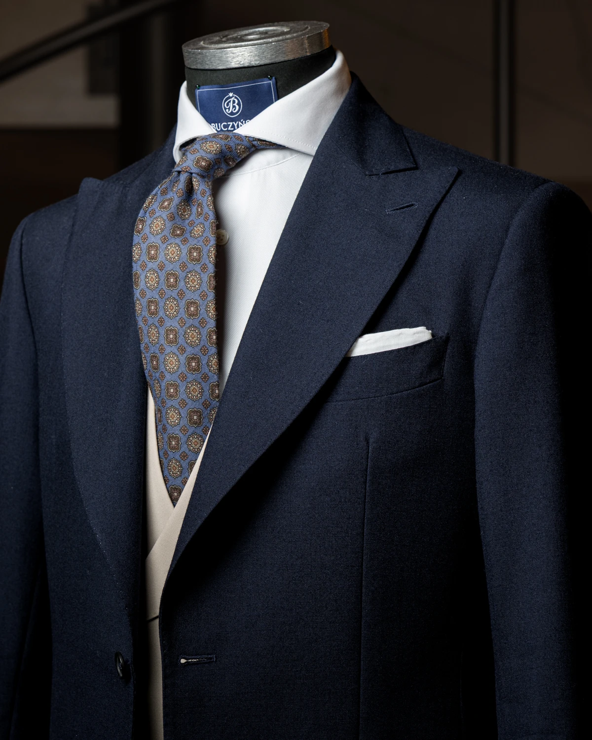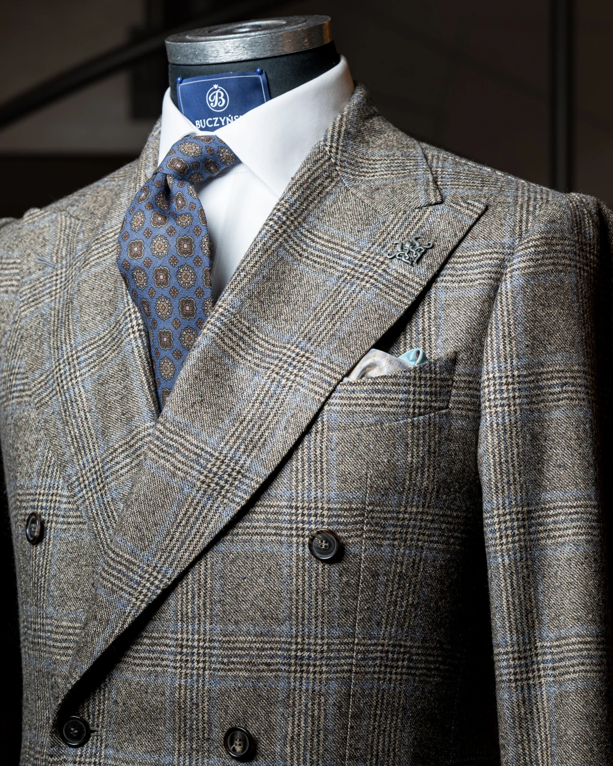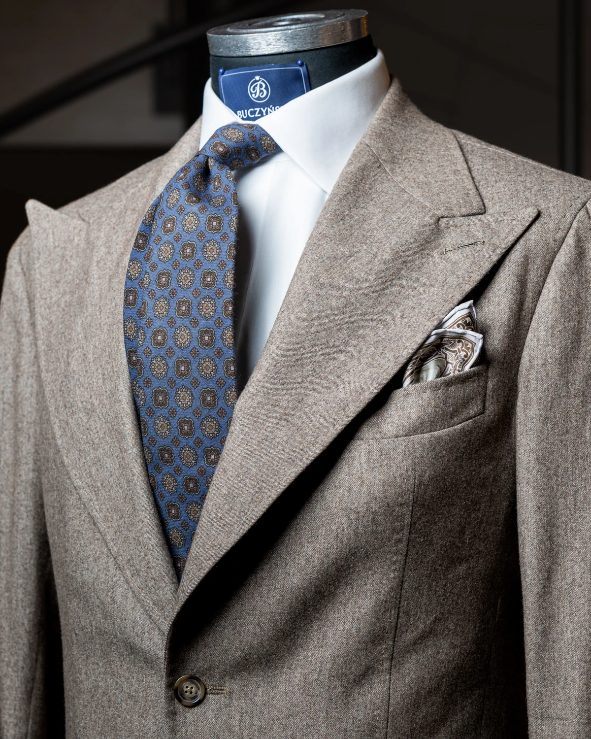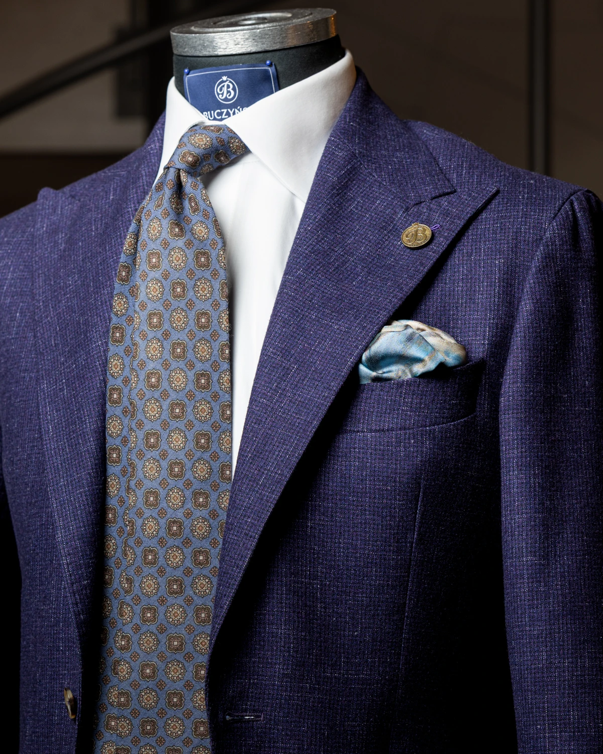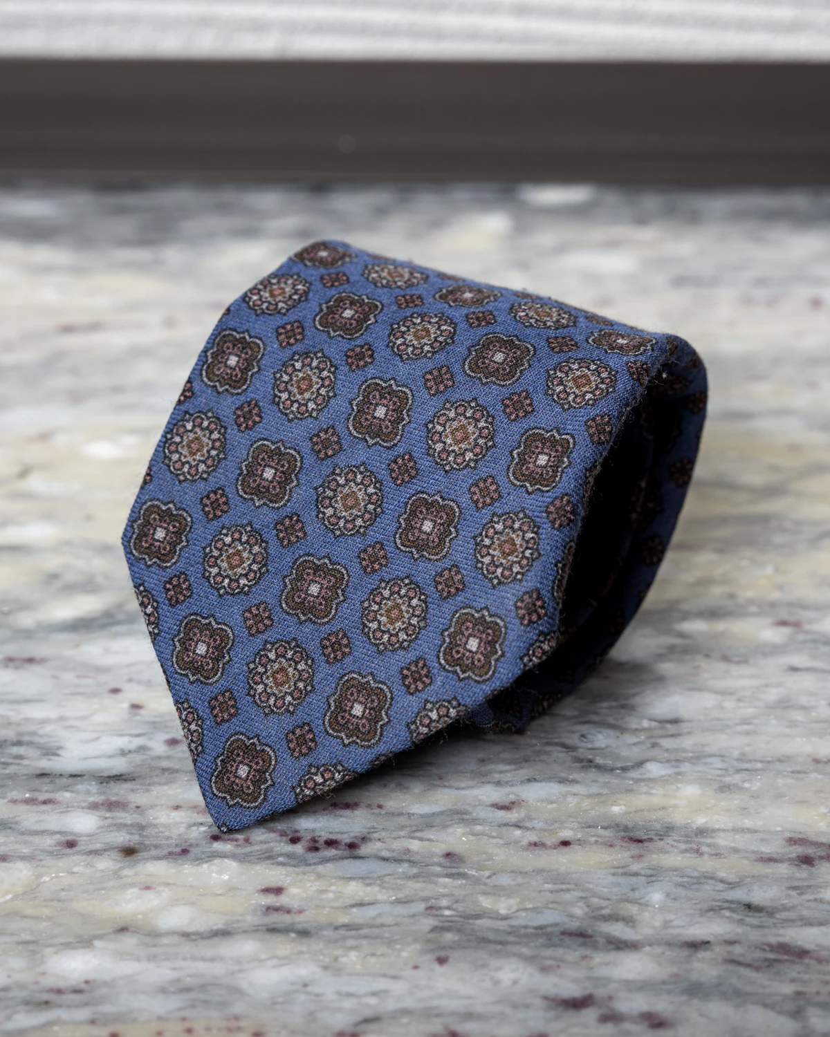 Wełniany krawat to świetny wybór nie tylko na chłodniejsze miesiące. Nasz niebieski model w brązowe ornamenty to dodatek, który subtelnie przyciąga wzrok wzorem, a jednocześnie pozostaje elegancki i łatwy do wkomponowania w codzienne stylizacje. Głęboki odcień niebieskiego w połączeniu z ciepłymi ornamentami tworzy klasyczne, harmonijne zestawienie kolorów, które dobrze współgra z marynarkami wykonanymi z matowych tkanin.