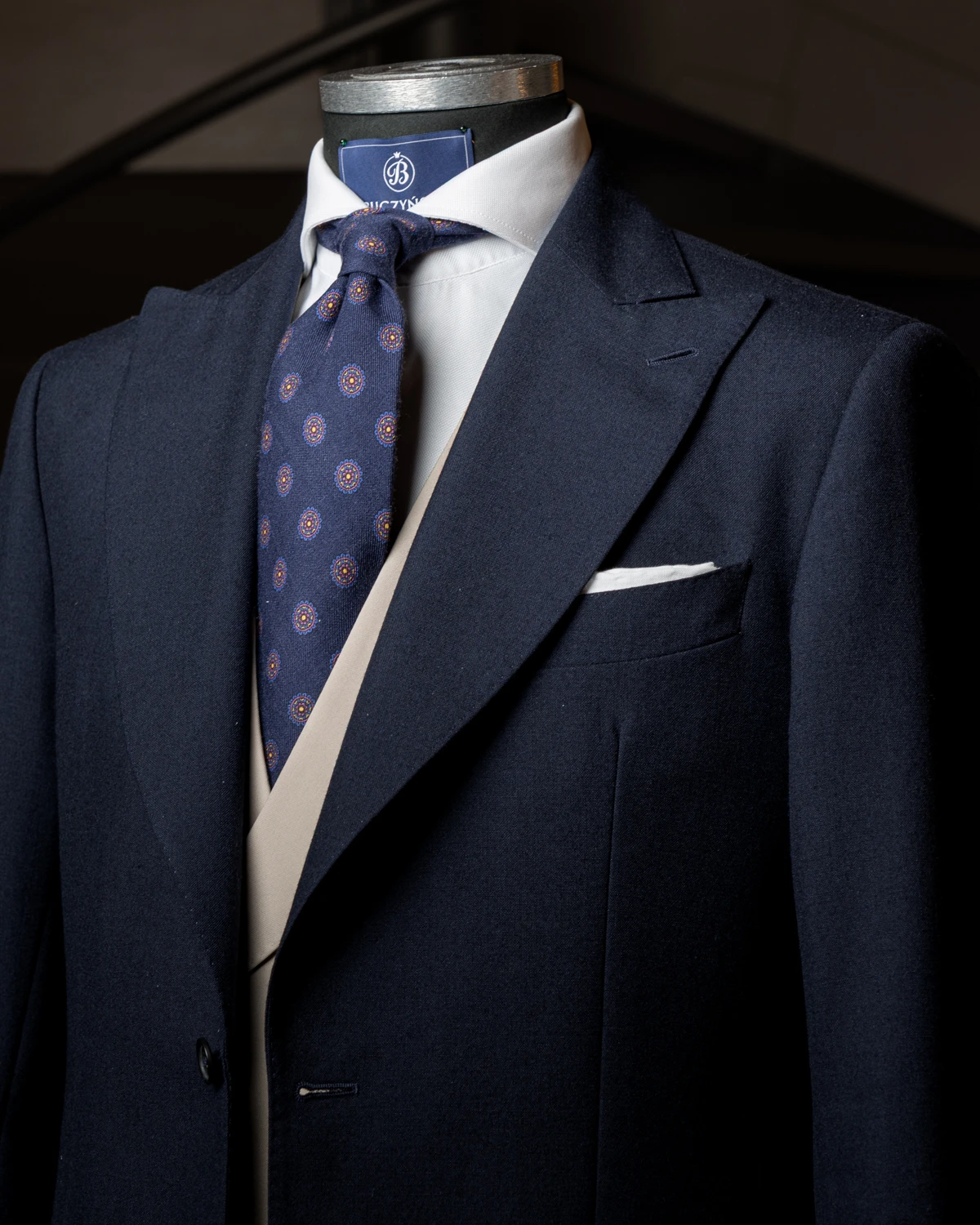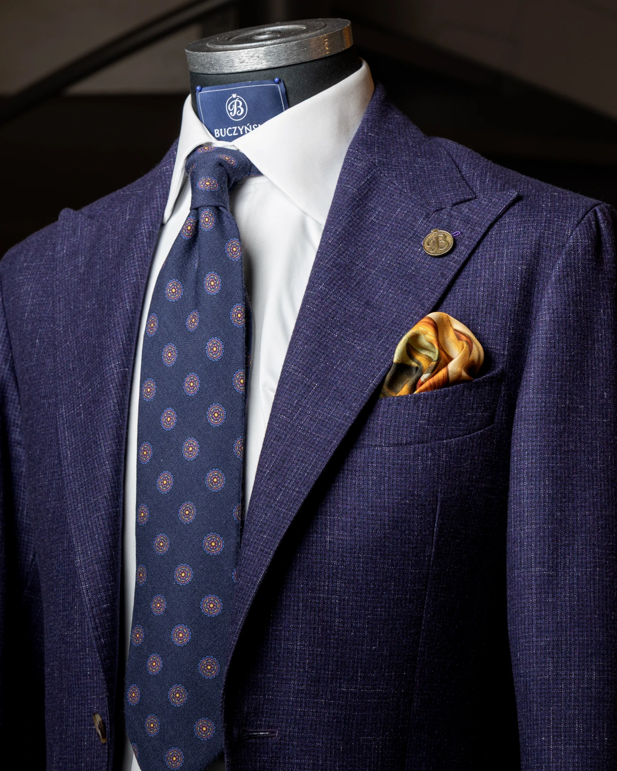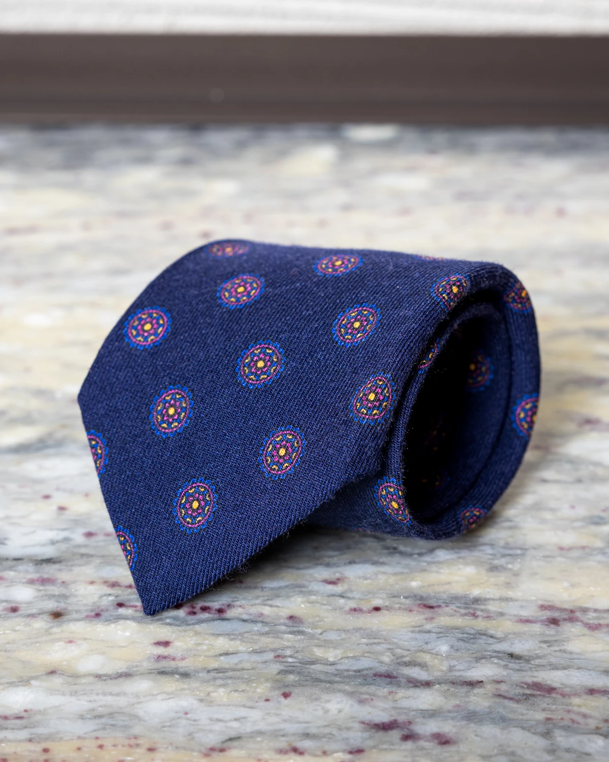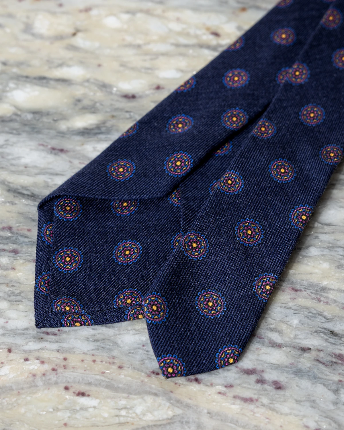 Nasz granatowy wełniany krawat w atramentowe ornamenty prezentuje się elegancko i dyskretnie, a jednocześnie oferuje interesującą głębię wzoru widoczną przy bliższym spojrzeniu. Tonalne zestawienie kolorów sprawia, że krawat pozostaje bardzo uniwersalny i z łatwością wpisuje się w różnorodne stylizacje.