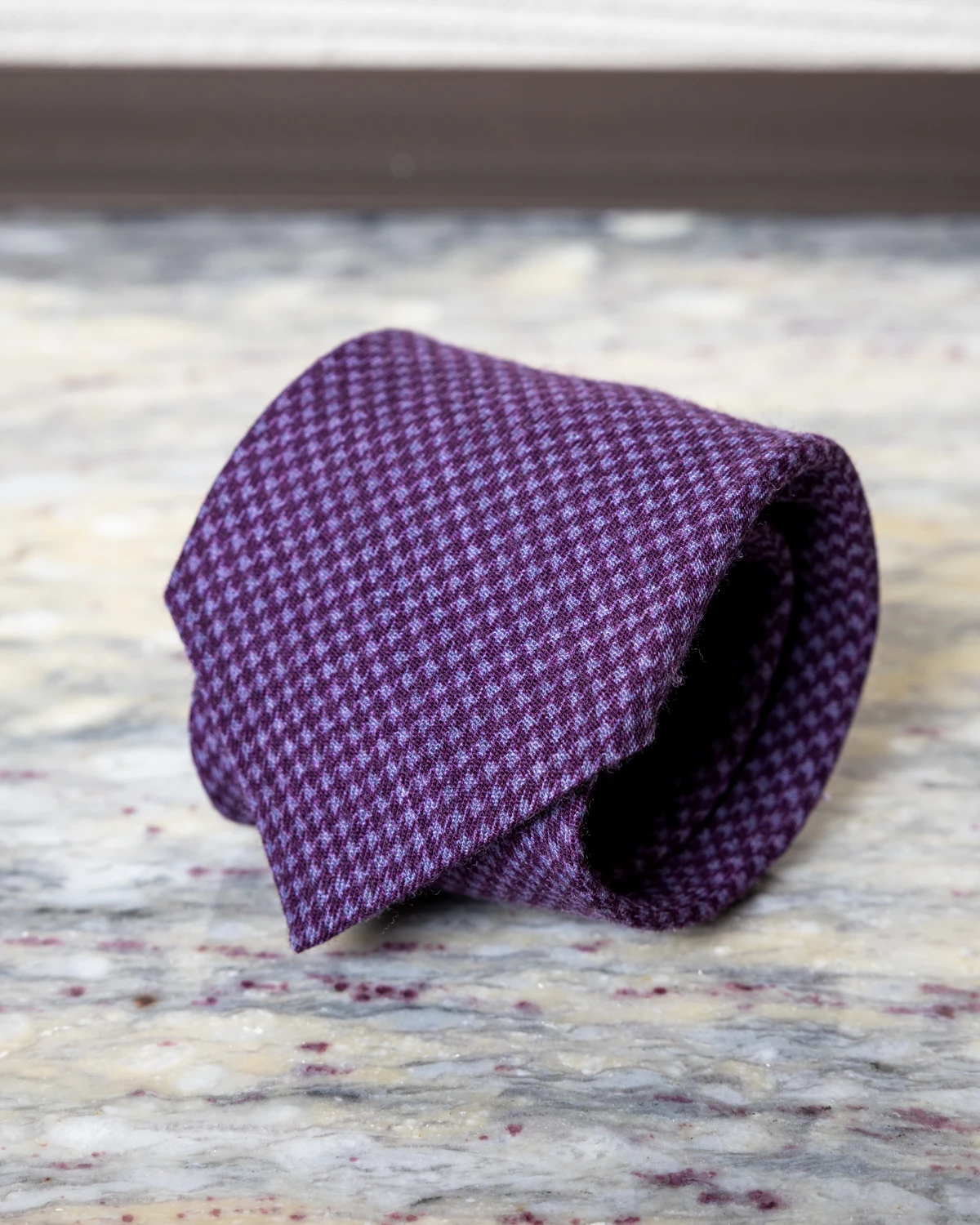 Krawat został uszyty w Polsce z wysokiej jakości włoskiej wełny o matowym, przyjemnym w dotyku wykończeniu. Klasyczne proporcje sprawiają, że dobrze się układa, tworzy estetyczny węzeł i pasuje do większości sylwetek oraz tradycyjnych szerokości klap marynarki. Szerokość krawata to 8,5cm, a długość ok. 150cm.