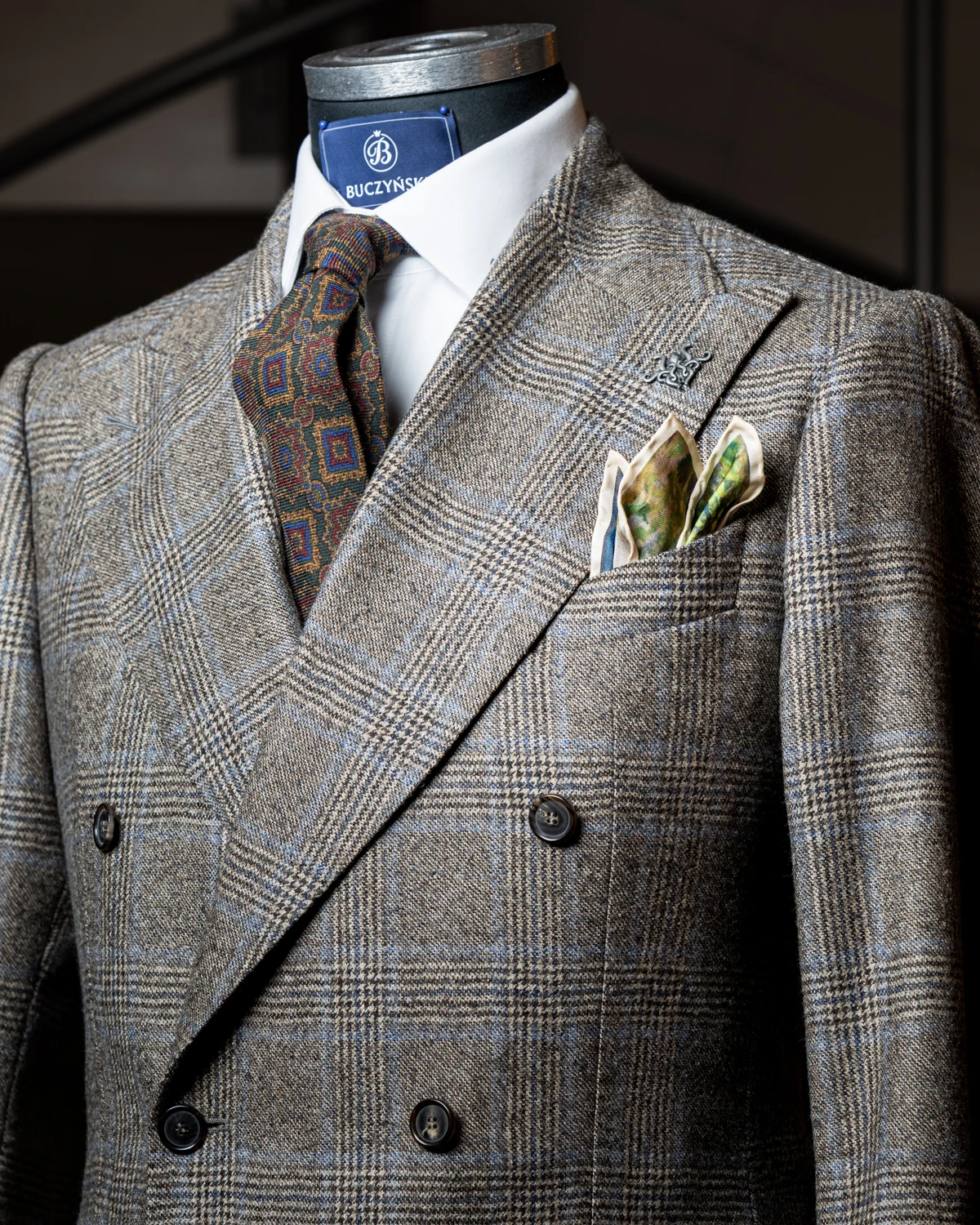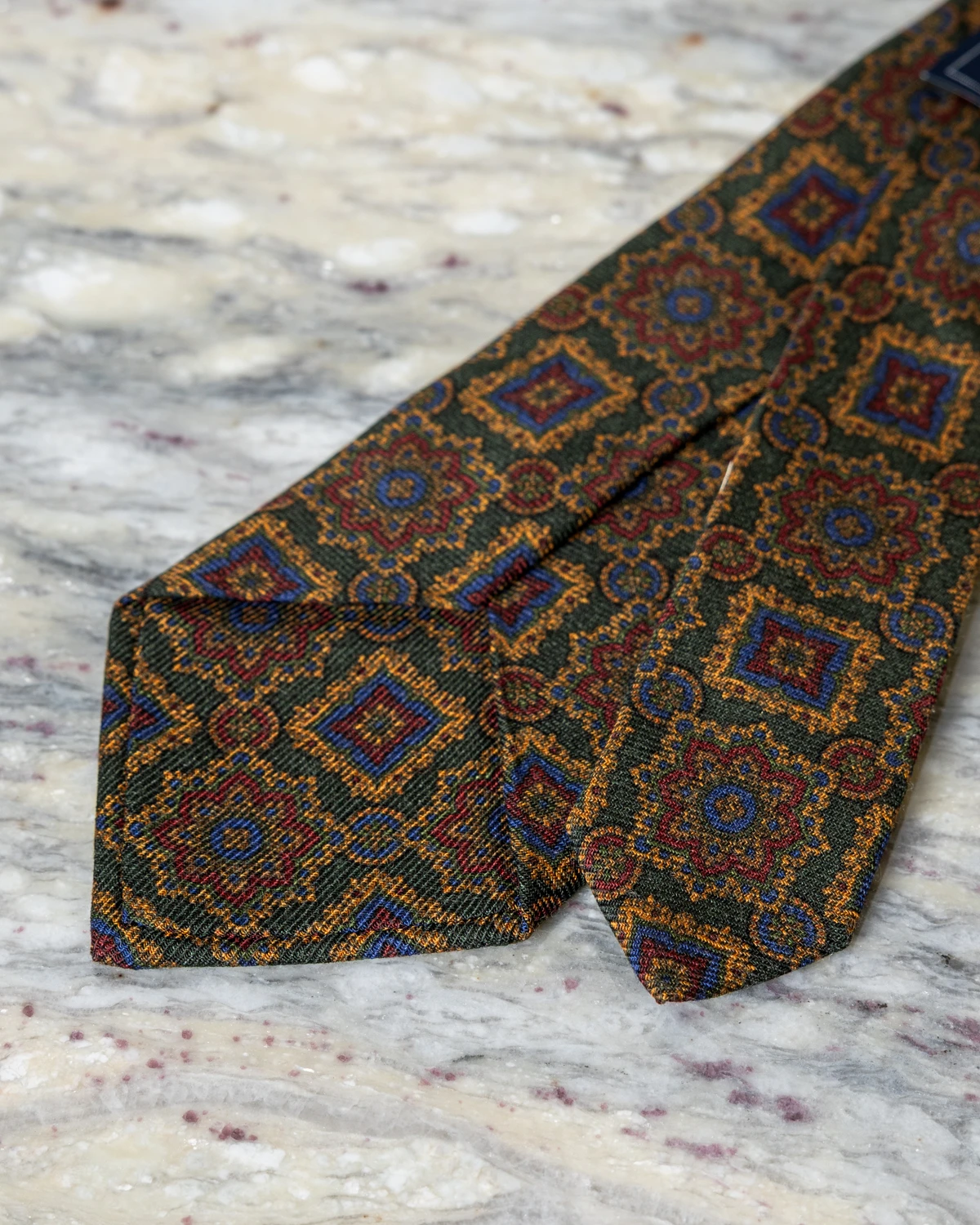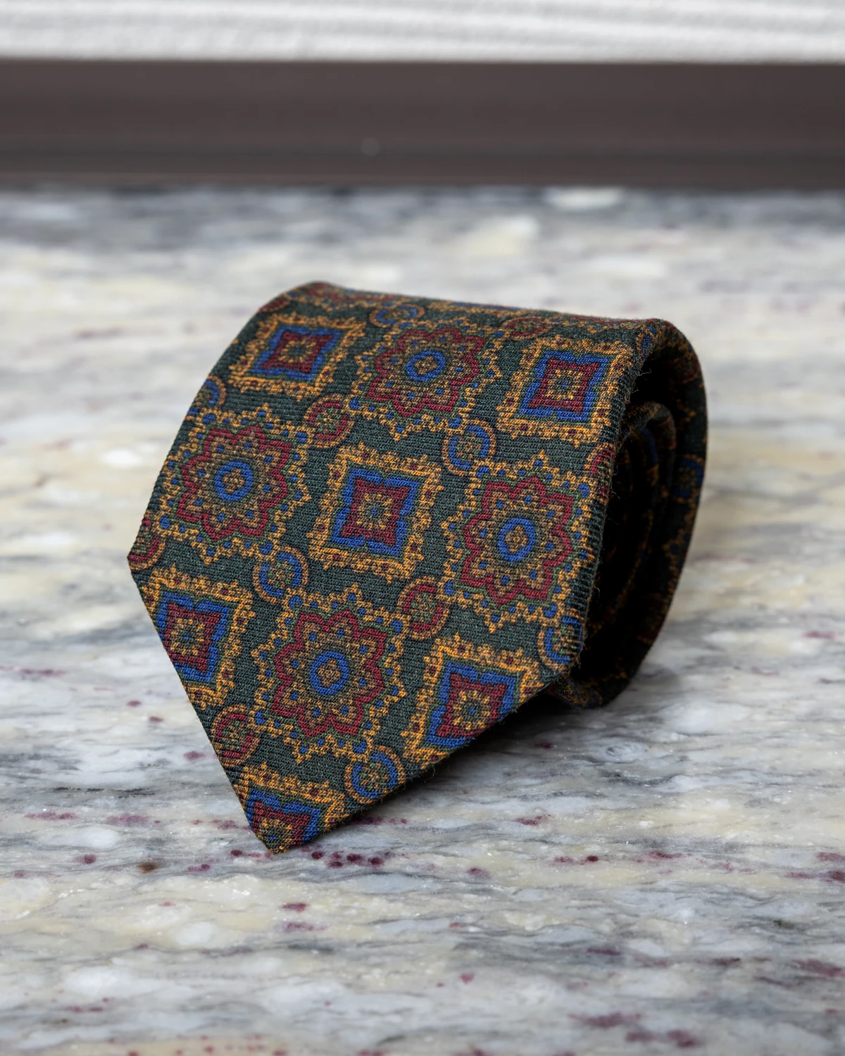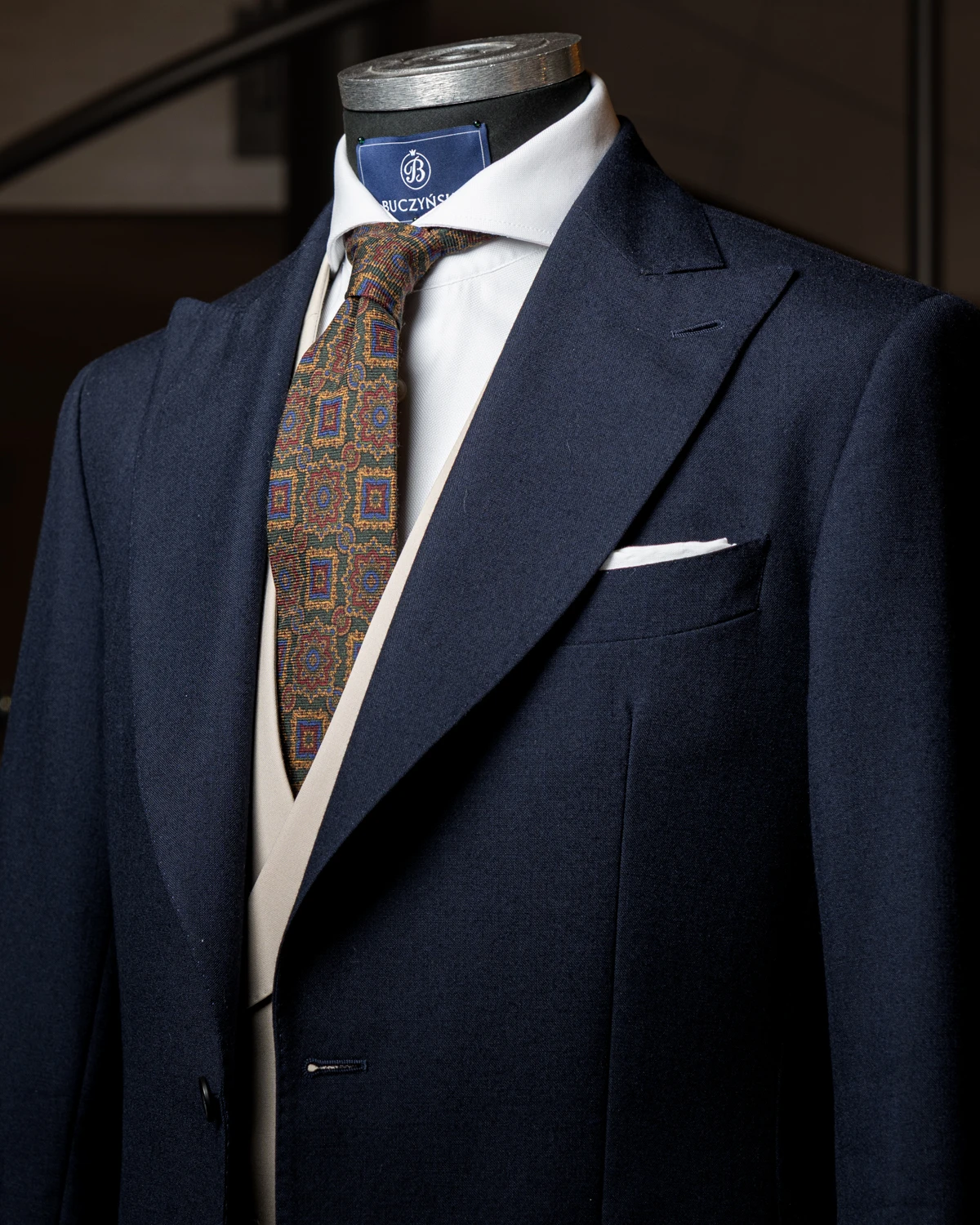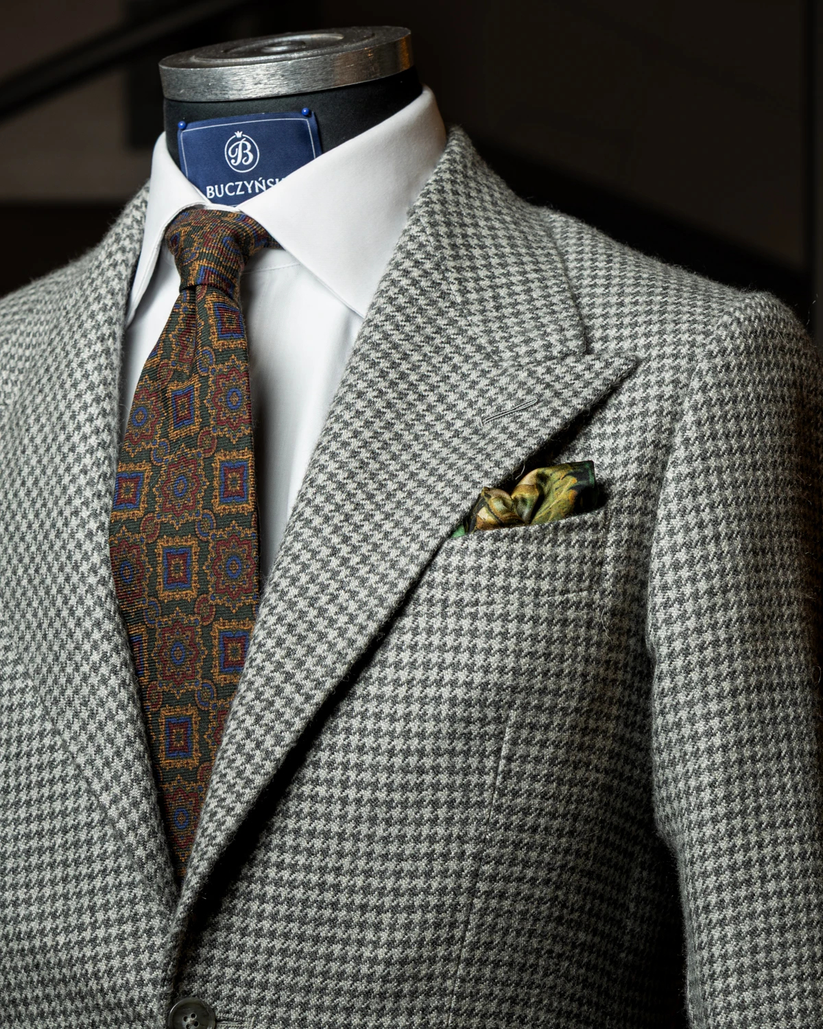 Przygaszona zieleń tworzy spokojną bazę, a większy, dekoracyjny wzór dodaje charakteru i sprawia, że krawat staje się ciekawym elementem stylizacji, nie przytłaczając jej. Całość ma lekko retro klimat i świetnie współgra z cięższymi, jesienno-zimowymi tkaninami. Krawat ten dobrze wygląda z białymi i błękitnymi koszulami, a także z marynarkami w odcieniach granatu, brązu, szarości czy beżu – szczególnie tymi wykonanymi z flaneli lub tweedu.