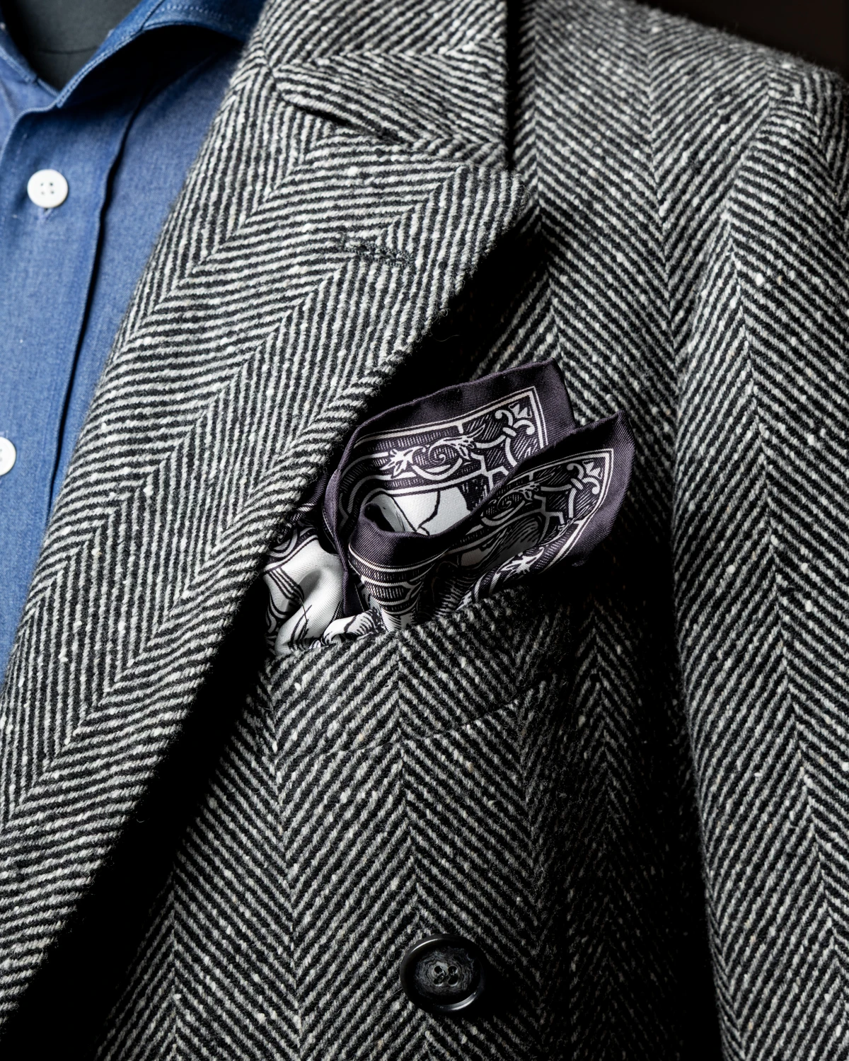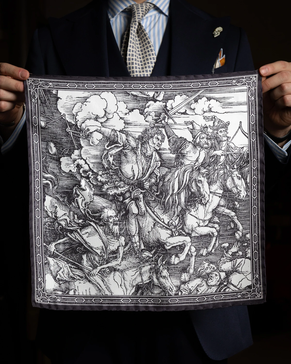 Prezentowany model został ozdobiony fragmentem obrazu „Czterech jeźdźców Apokalipsy” Albrechta Dürera. Wzór opiera się na stonowanej palecie barw – dominują biele, szarości czernie, które nadają poszetce wyrazisty, klasyczny charakter. Takie barwy dobrze komponują się zarówno z eleganckimi garniturami, jak i mniej formalnymi marynarkami.