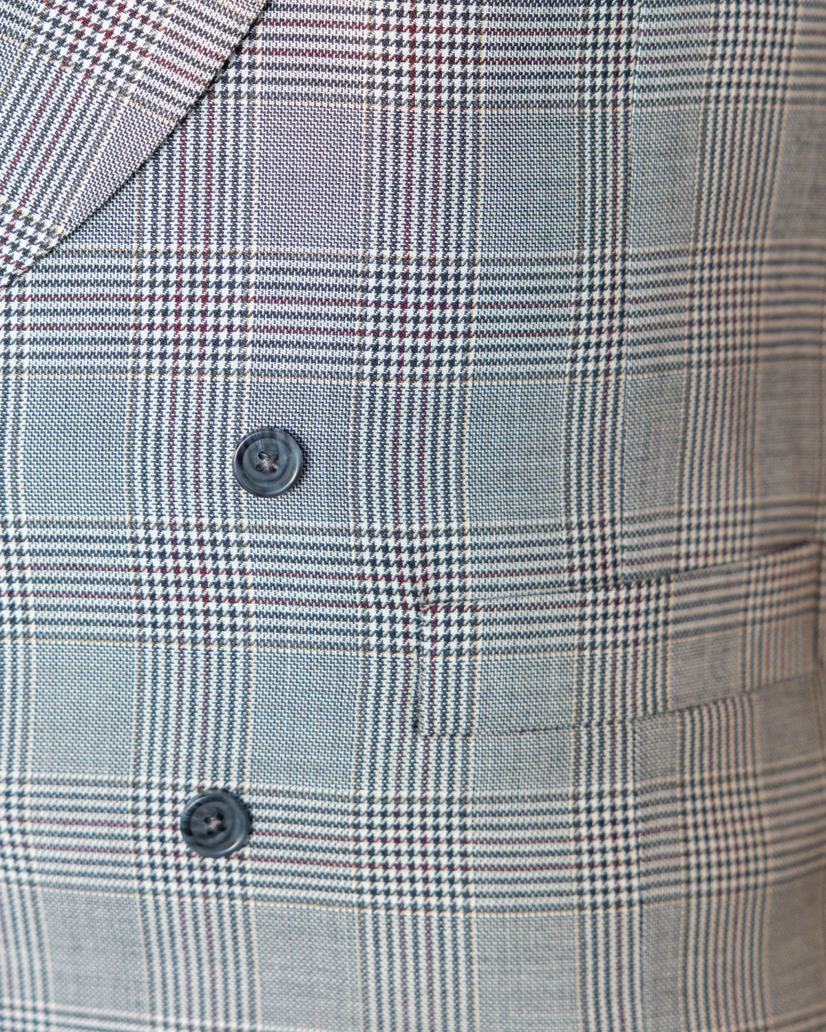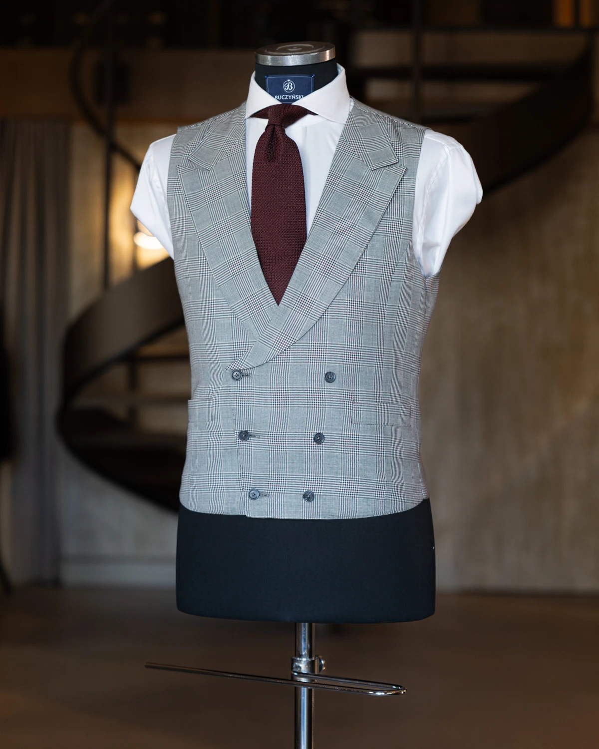 Do uszycia kamizelki wykorzystano szlachetną mieszankę wełny i jedwabiu, która zapewnia komfort noszenia, odpowiednią przewiewność oraz trwałość. Klasyczna krata na szarym tle dodaje głębi i charakteru – pozostaje dyskretna z daleka, a z bliska ujawnia swój szlachetny detal.