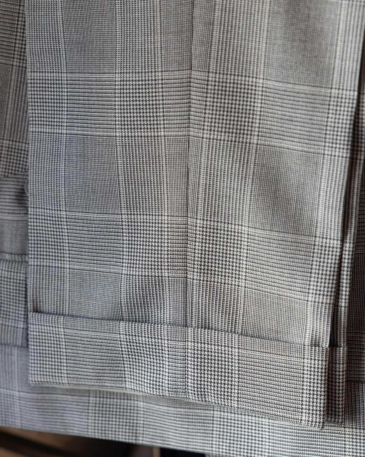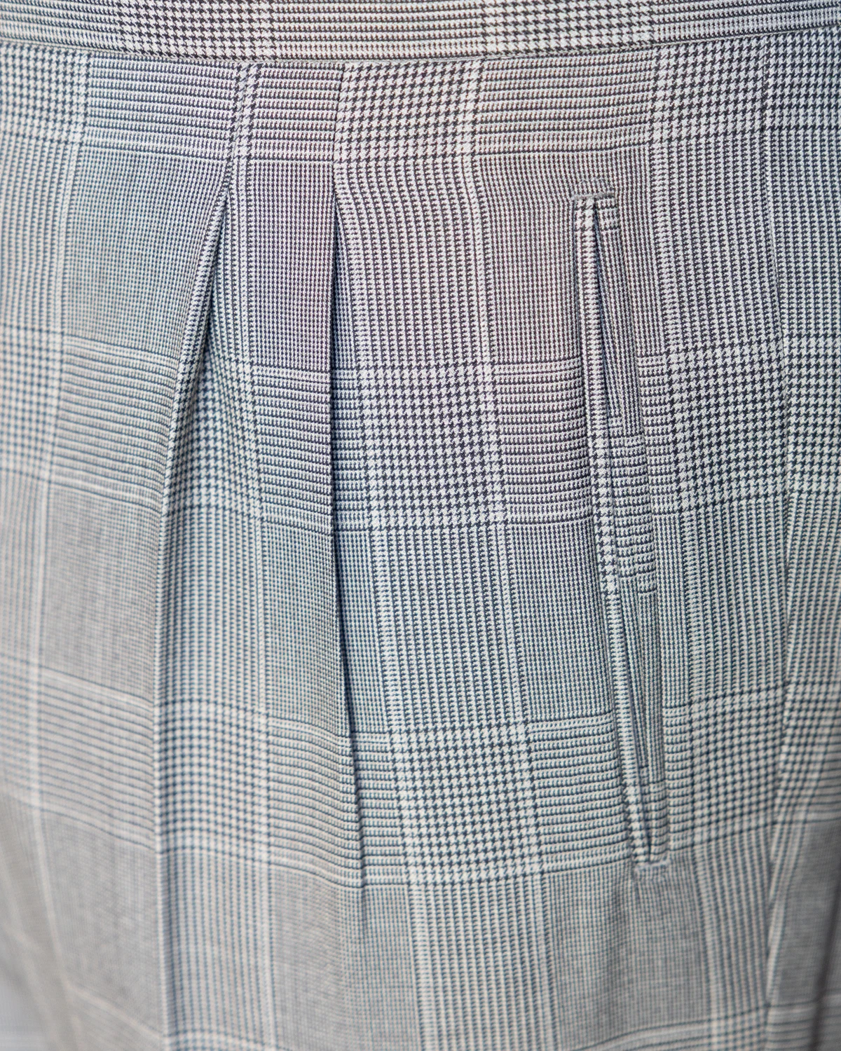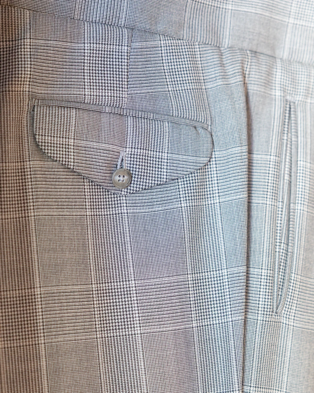 Model został wyposażony w dwie zakładki, które nie tylko podnoszą komfort noszenia, ale również nadają sylwetce lekkości i swobody. Wysoki stan podkreśla talię i optycznie wydłuża nogi, a szerokie mankiety o szerokości 5 cm dodają całości wyrafinowanego, sartorialnego charakteru. Tylne kieszenie z patkami i przednia bilonówka to nie tylko eleganckie ale i praktyczne detale, który dopełniają klasyczny wygląd spodni. Model ten posiada także guziki na szelki.