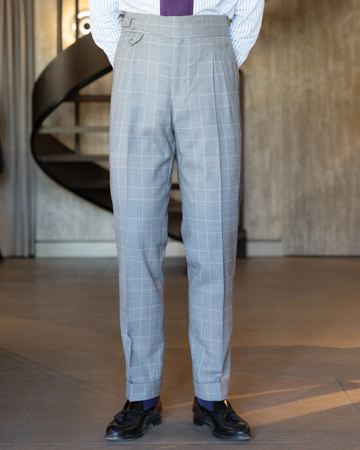 Nasze szare spodnie w kratę z wysokim stanem to propozycja dla mężczyzn, którzy cenią klasykę w nowoczesnym wydaniu. Ponadczasowy wzór w kratę nadaje im charakteru, jednocześnie pozwalając na większą swobodę w budowaniu stylizacji – od formalnych po smart casualowe.