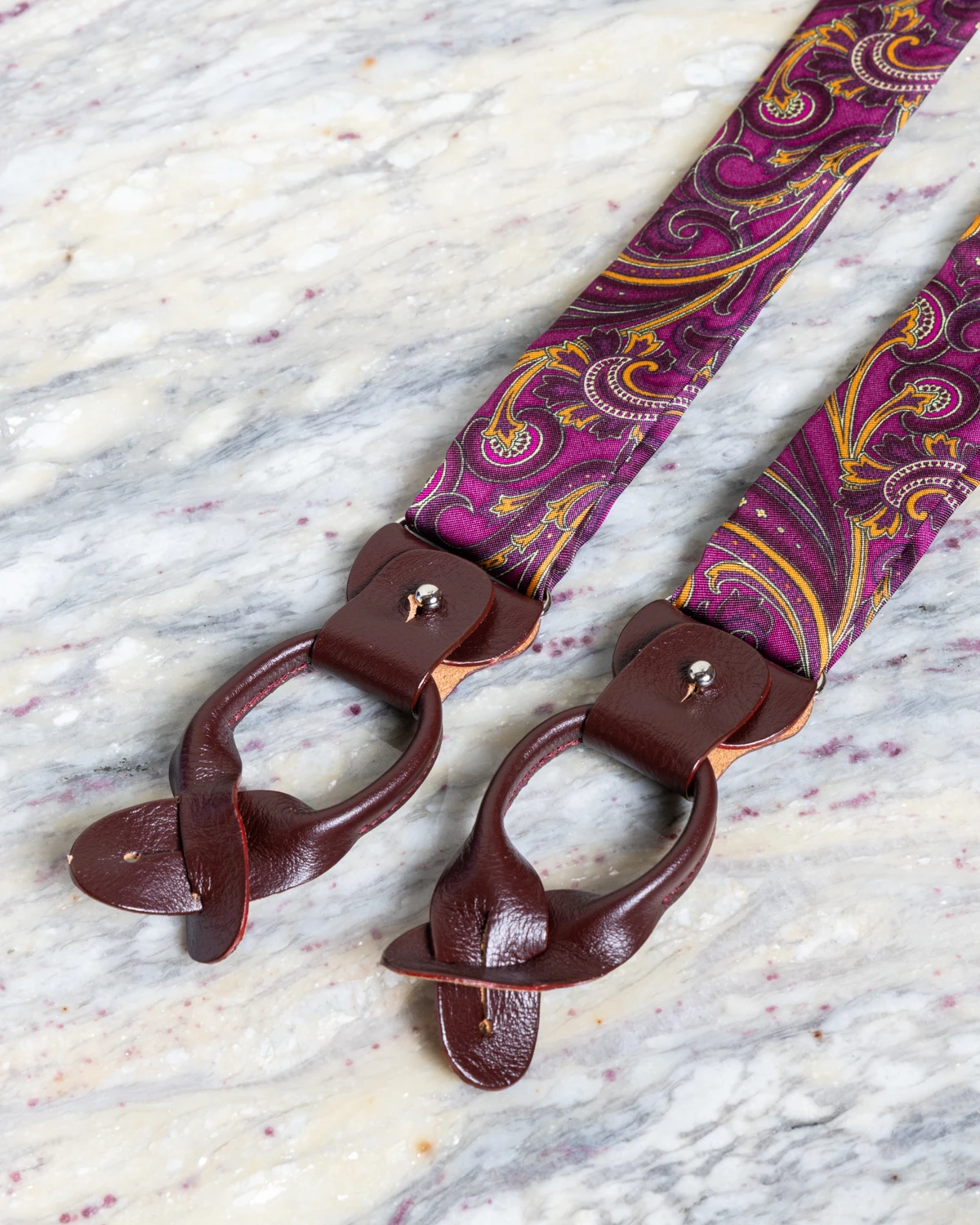 Szelki wykonane z jedwabiu w kolorze różowym w złoty wzór paisley to propozycja dla osób, które lubią wyróżniać się stylem, nie rezygnując przy tym z elegancji. Połączenie delikatnego różu z ciepłym odcieniem złota tworzy wyrafinowaną, przyciągającą wzrok kompozycję. Klasyczny motyw paisley dodaje całości głębi i lekko dekoracyjnego charakteru, dzięki czemu szelki prezentują się stylowo i z nutą ekstrawagancji.