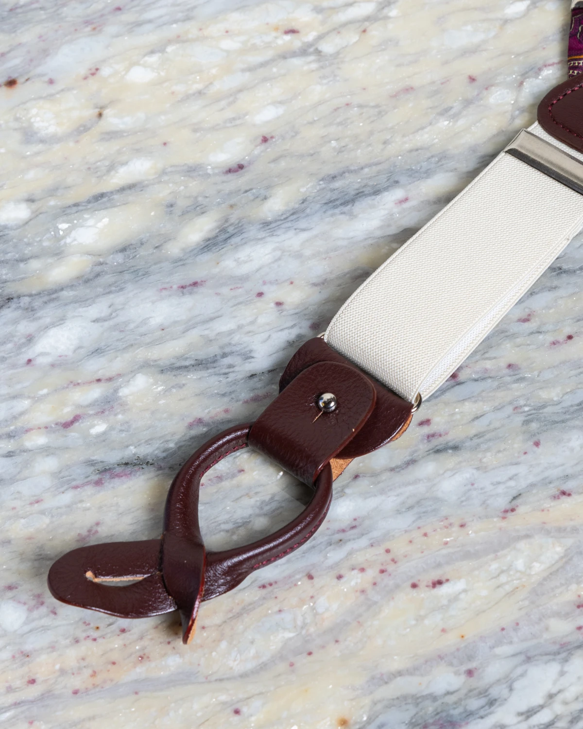 Szelki zostały wytworzone w małej manufakturze w Polsce. Zapięcia na guziki wykonane są z burgundowej skóry i mają ręcznie malowane brzegi, natomiast klamerki wykonano ze srebrnej stali nierdzewnej.