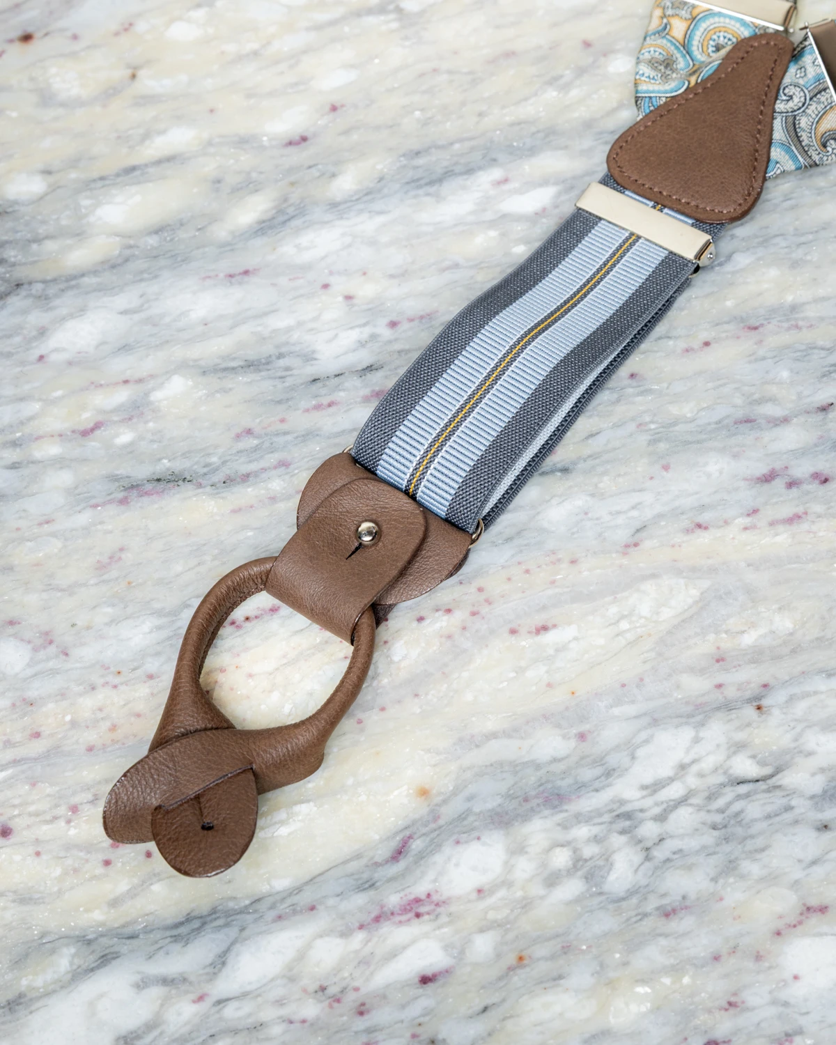 Szelki zostały wytworzone w małej manufakturze w Polsce – zapięcia na guziki wykonane są z beżowej skóry i mają ręcznie malowane brzegi, klamerki są wykonane ze srebrnej stali nierdzewnej.