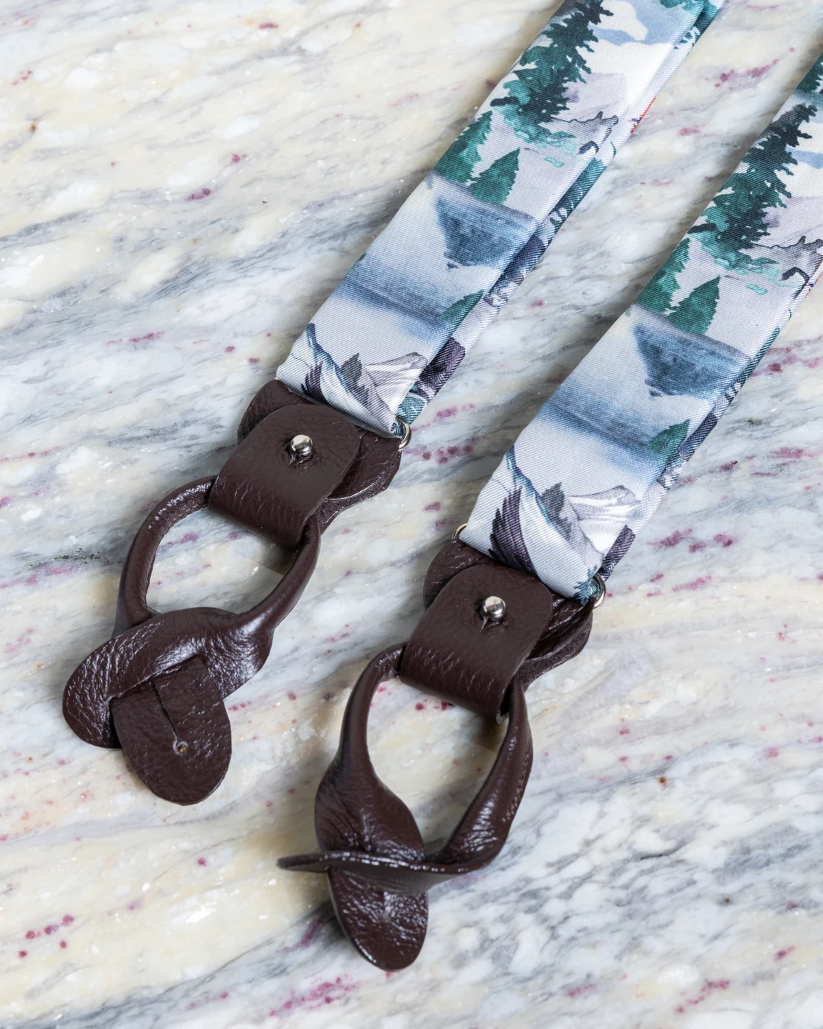 Szelki wykonane z jedwabiu z motywem górskim to propozycja dla osób, które lubią dodatki z charakterem. Grafika przedstawiająca zaśnieżony stok, tworzący wyjątkową, malowniczą kompozycję – dominują tu chłodne odcienie bieli i błękitu, przełamane akcentami zieleni oraz czerwieni. Całość przywodzi na myśl zimowy krajobraz i nadaje stylizacji świeżości, lekkości oraz nieco bardziej swobodnego charakteru.